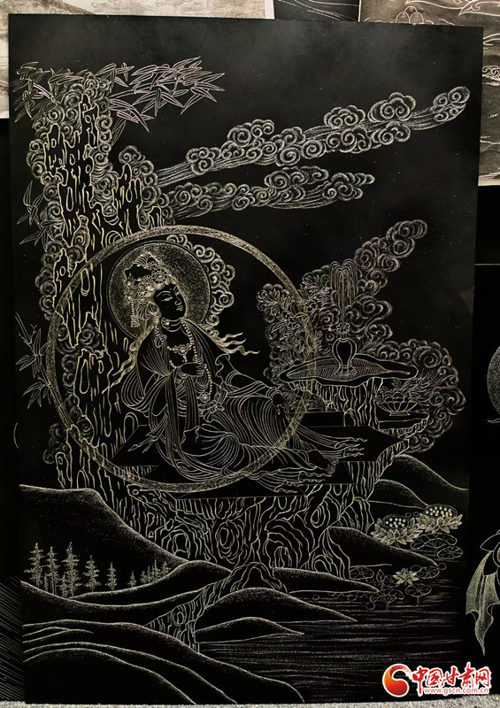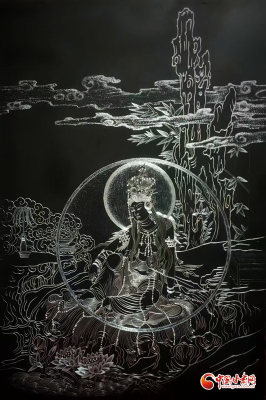 对张兆武来说,做锲金画从来不是“照猫画虎”。他琢磨传统书画的笔墨、篆刻的力道,慢慢攒出了自己的一套刀法;创作时,心里装的也全是敦煌——从莫高窟第112窟里“反弹琵琶”的灵动舞姿,到传说中“九色神鹿”的温润模样,都成了他刻刀下的主角。他刻出的飞天,飘带像带着风;刻出的菩萨,眉眼间透着庄重;金属的光泽在画面上流转,明明是静态的画,却像在讲一段活的敦煌故事。“不用多说什么,看过的人能懂这份美。”张兆武说的这份“懂”,恰恰打破了文化和语言的距离,让东方的古老美学,和全世界的现代审美碰出了共鸣。