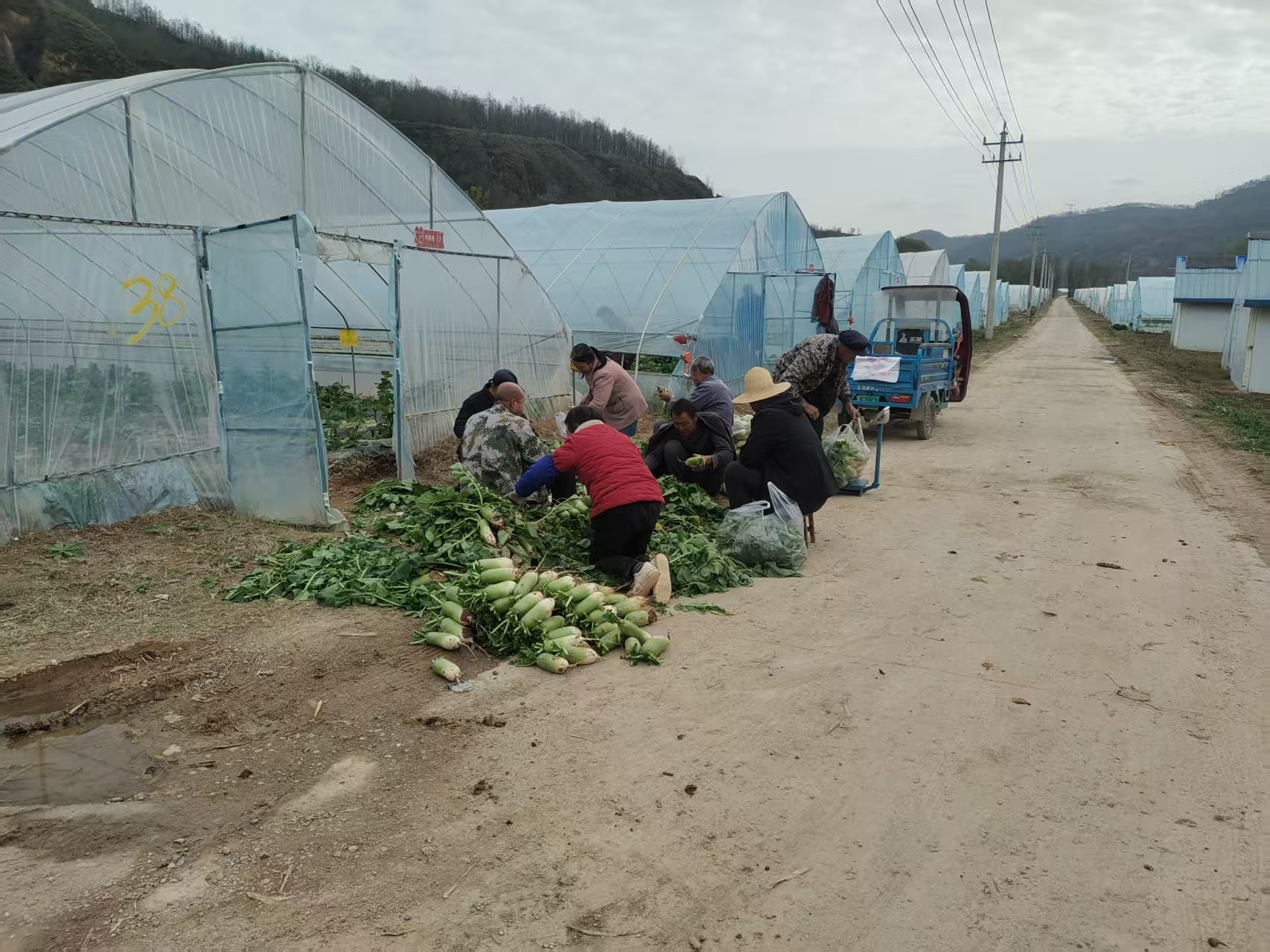 “今年咱们寺沟村把54座中拱棚整合成‘共享大棚’,让周边三个兄弟村一起种植螺丝椒。这种‘投入少、周期短、见效快’的发展模式,真正为村集体带来了可观收益!”正在对接萝卜订单的冯家山村党支部书记马莉霞满面笑容地说道,“8月底收完最后一茬辣椒后,我们紧抓农时,‘换茬不闲地’,陆续种下了41棚萝卜、36棚甘蓝和3棚香菜。如今这些作物长势良好,‘一棚多收’的模式大大提高了土地利用率,效益也实现了最大化。”