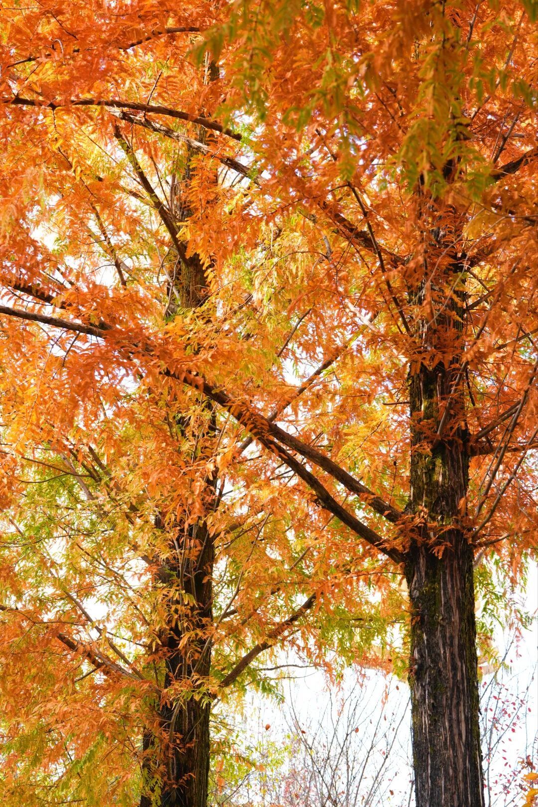 它们静默地立着,每一株都是一座燃烧的、无声的火焰。那色彩,是说不尽的。并非单纯的赤红,也非一律的赭黄,而是一场色彩的盛大交响。低处的枝叶,还贪恋着夏日的旧梦,固执地守着一丝苍绿,那绿里却已浸透了秋的醇黄,成了黄绿相间的、有些忧郁的调子。再往上,便是主调了——那是杏黄、是金黄、是橘红,是种种暖到极处的颜色最和谐的融合。阳光透过这些叶子,它们便成了半透明的琉璃片,薄薄的,亮亮的,仿佛一碰,就会叮咚作响。