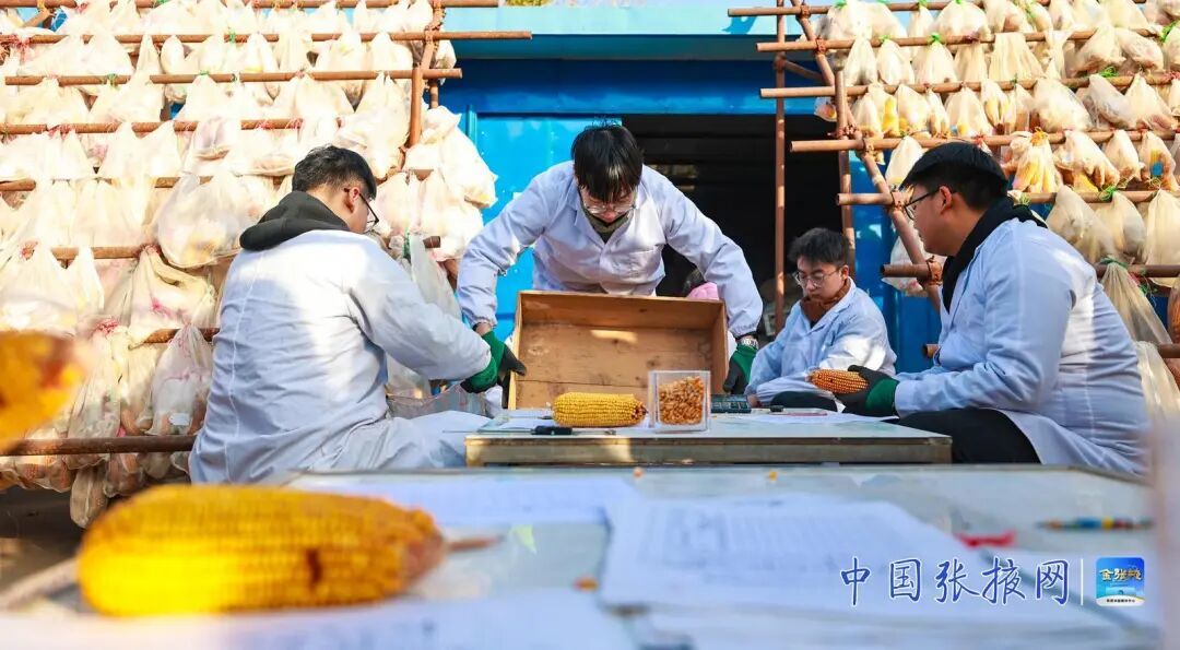 初冬的张掖大地,虽然田野间的丰收盛景悄然落幕,但在张掖玉米科技小院,另一场关乎未来的“实验田”才刚刚开始,来自甘肃农业大学和河西学院的学生们正专注开展考种工作,脱粒、称重、测量、记录、分析每一个关乎品种改良方向的数据。他们身后,层层支架上悬挂的一袋袋玉米种子承载着育种研究创新希望。