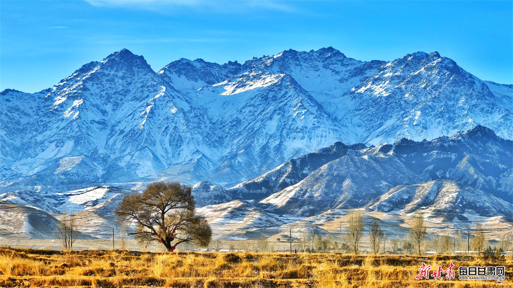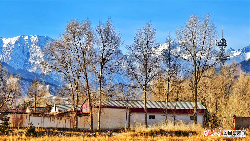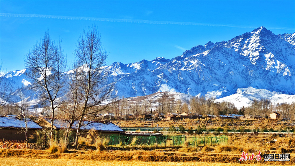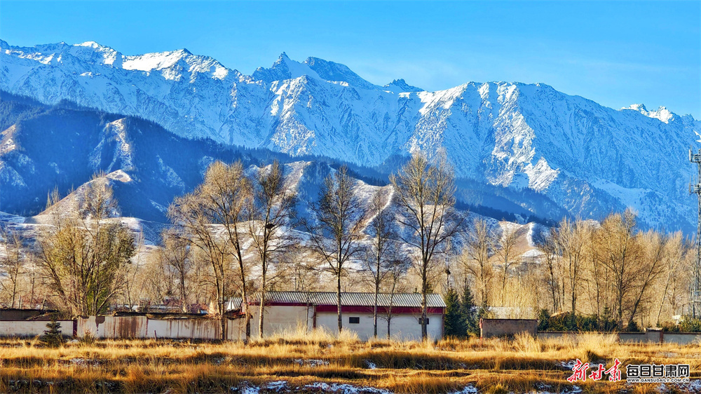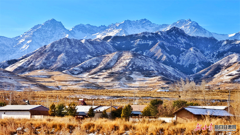 初冬时节,张掖市民乐县妖娆多姿、风光旖旎。远处,祁连山脉巍峨矗立,山顶的皑皑白雪在澄澈蓝天的映衬下更显圣洁雄浑。山峦层次分明,或覆雪如银,或露岩似黛,在光影交错中勾勒出硬朗的轮廓。山脚下的村落,房屋错落,树木或叶片落尽、枝桠疏朗,或仍有残叶点缀,与金黄的草地相映成趣,宛如一首无声却动人的交响乐,让人心生向往。