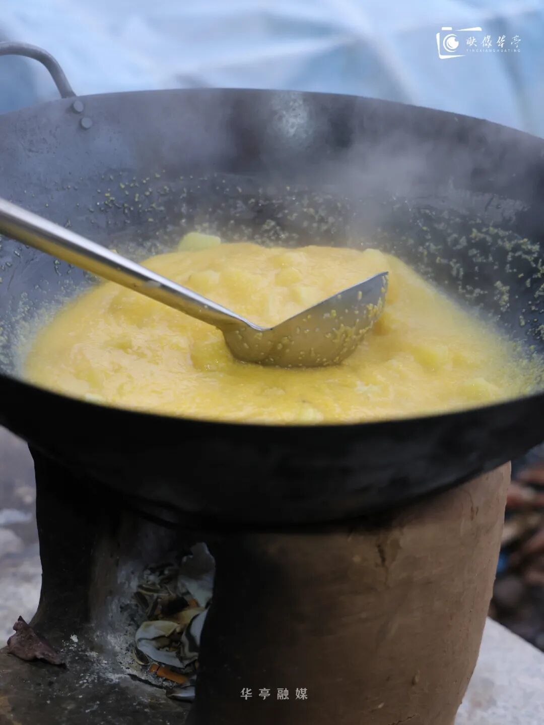 华亭馓饭,是流淌在锅灶间的智慧。一个“馓”字,道尽了其制作精髓——将玉米、豆面等杂粮粉,配以洋芋块、萝卜丁等时蔬,均匀地撒入滚水,同时用筷子或擀面杖顺着一个方向不停搅拌,使其与水充分融合,由清变浊,从稀到稠,最终化为一锅金黄浓稠、香气扑鼻的糊糊。