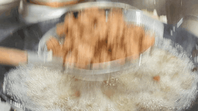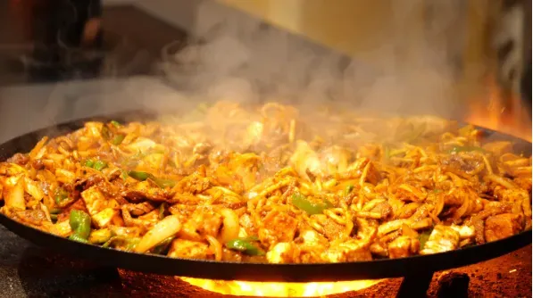 师傅娴熟地翻动着食材