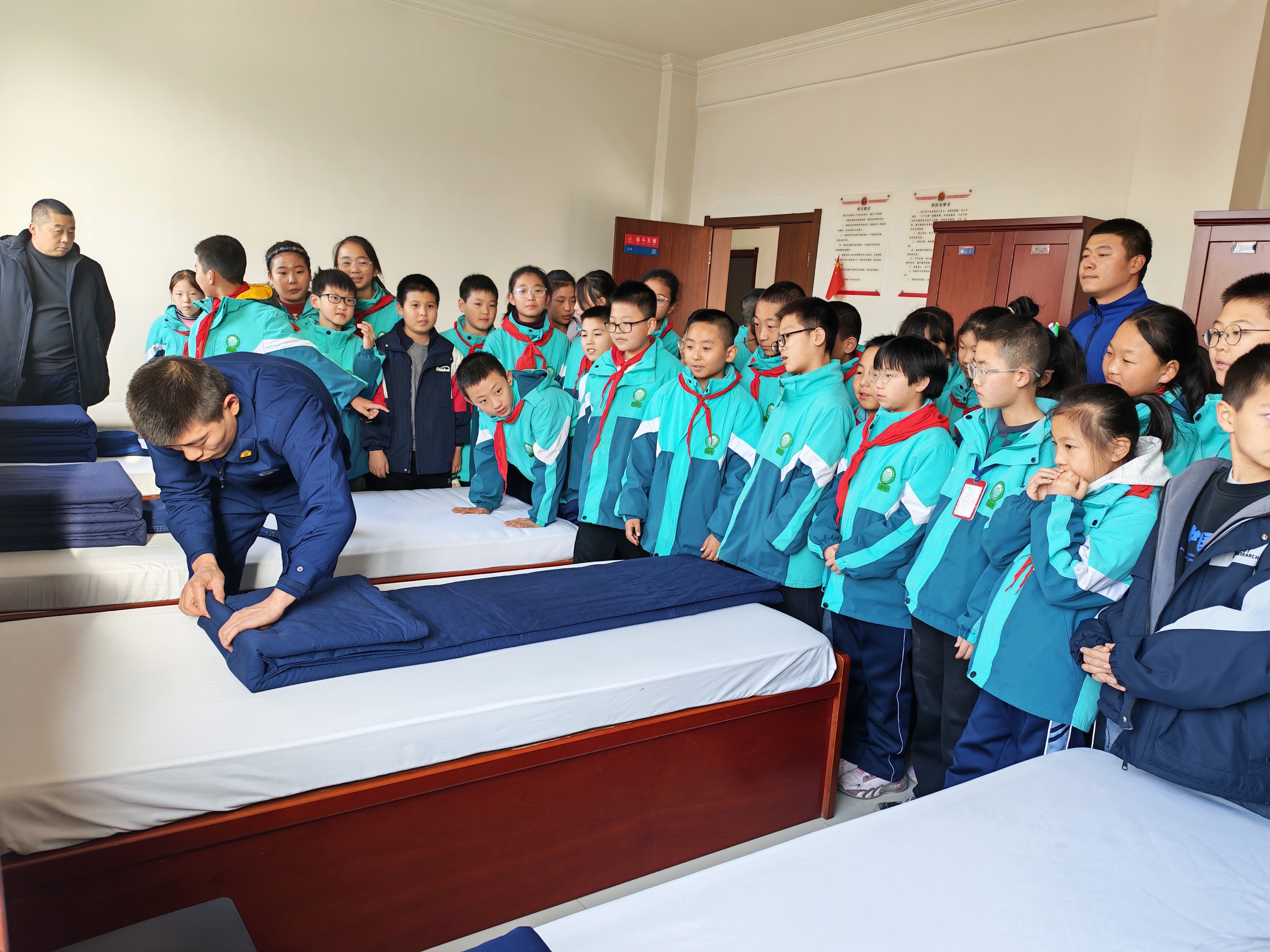 在消防员的带领下,师生们开启“消防探秘之旅”。走进科普教育基地,图文展板、真实案例讲解让“安全用火用电”不再枯燥;车库里,锃亮的消防战车张开“巨臂”,消防员掀开装备箱,手把手教大家识别破拆工具;来到宿舍,叠得方方正正的“豆腐块”被子让孩子们忍不住伸手触摸,纷纷感叹“消防员叔叔好自律!”