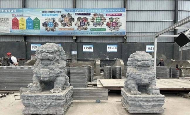 “工欲善其事,必先利其器”,在华亭市绿色建材产业园3D打印车间里,设备喷头托着掺固废的混凝土浆料移动,半米高的石狮子雏形正层层堆叠成型。