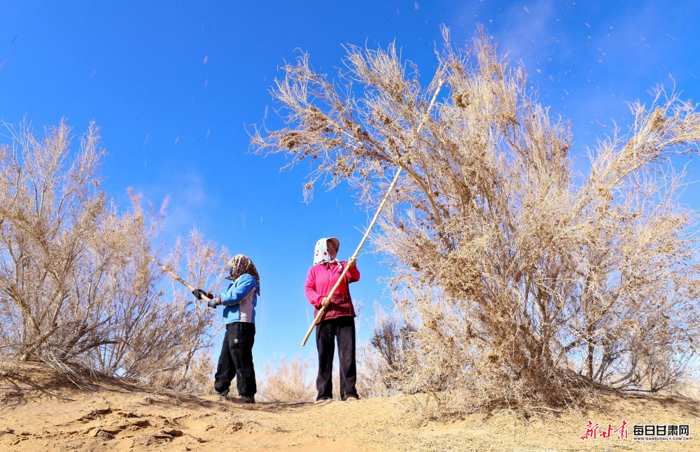 11月25日,张掖市临泽县治沙林场的省级乡土树种采种基地内,沙海之上一派繁忙景象。3000多亩梭梭林迎风而立,100多名林业工作人员手持木棒轻轻敲打梭梭母树枝条,沙沙声响中,被誉为“沙漠卫士”的梭梭种子纷纷坠落,为西北荒漠治理积攒“绿色希望”。