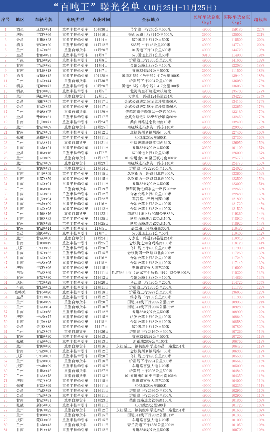 现将10月25日—11月25日全省查处的81辆超载100%以上的大货车违法名单予以警示曝光。公安机关将依据相关法律法规,对此类违法行为严格执法、严肃处理!希望广大货车驾驶人引以为戒。