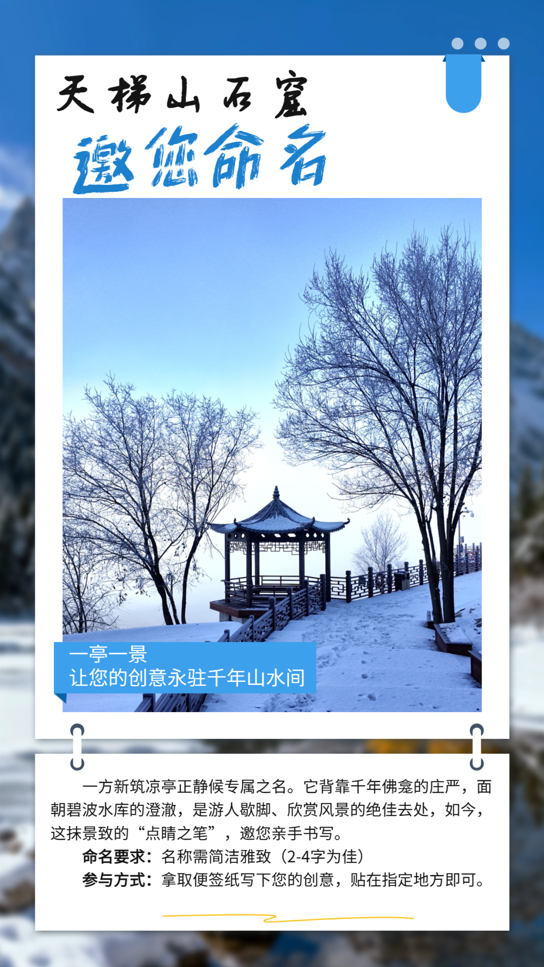 此次凉亭征名,不限风格、不设门槛,只要您的创意能贴合天梯山“佛、山、水”的千年意境,或是能传递休憩赏景的闲适心境,皆可参与。您笔下的名字,或许会成为未来无数游客与这座石窟对话的记忆锚点,让每一次驻足都多一份专属故事。