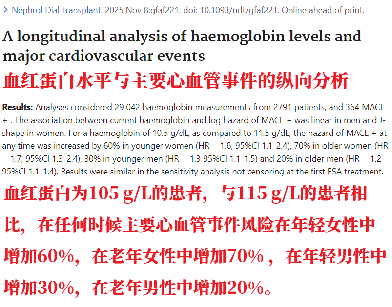 比如权威杂志NDT最近发表的一篇研究显示:在2791名未使用促红细胞生成素(ESA)治疗的2-5期慢性肾病患者中,血红蛋白为105 g/L的患者,与115 g/L的患者相比,主要心血管事件风险,在年轻女性中增加60%,在老年女性中增加70%,在年轻男性中增加30%,在老年男性中增加20%。