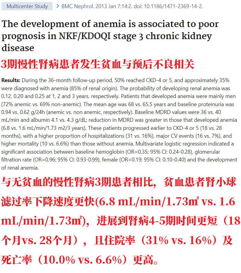 一项针对439例慢性肾病3期患者的研究显示,随访3年后,与无贫血的慢性肾病3期患者相比,贫血患者肾小球滤过率下降速度更快(6.8 mL/min/1.73㎡vs. 1.6 mL/min/1.73㎡),进展到肾病4-5期时间更短(18个月vs. 28个月),且住院率(31% vs. 16%)及死亡率(10.0% vs. 6.6%)更高。