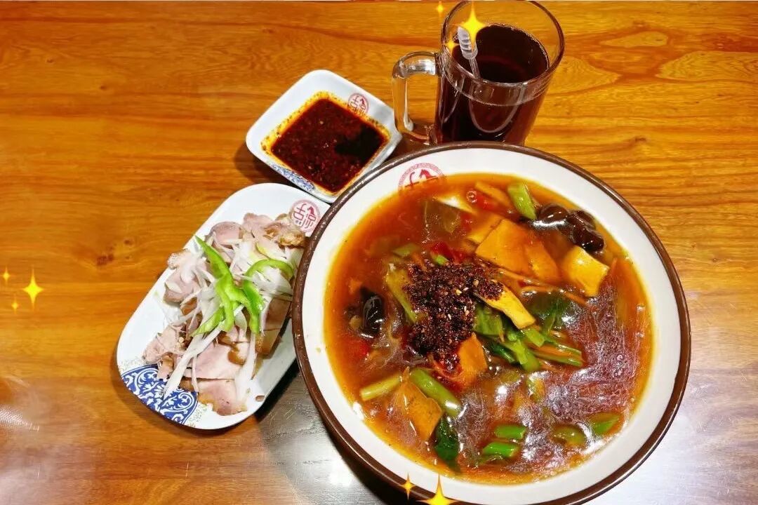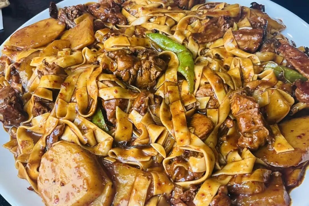 清晨的姑臧合市早已飘来阵阵香气,地道的三套车正等待着你的品尝。劲道的长面配上醇香的卤肉,再啜饮一口温热的茯茶,整个人都暖和了起来。谁说中午要随便应付?武威人对面食的执着可不容小觑!姑臧农舍的炒鸡配上吸饱汤汁的皮带面,每一口都是满满的幸福感。