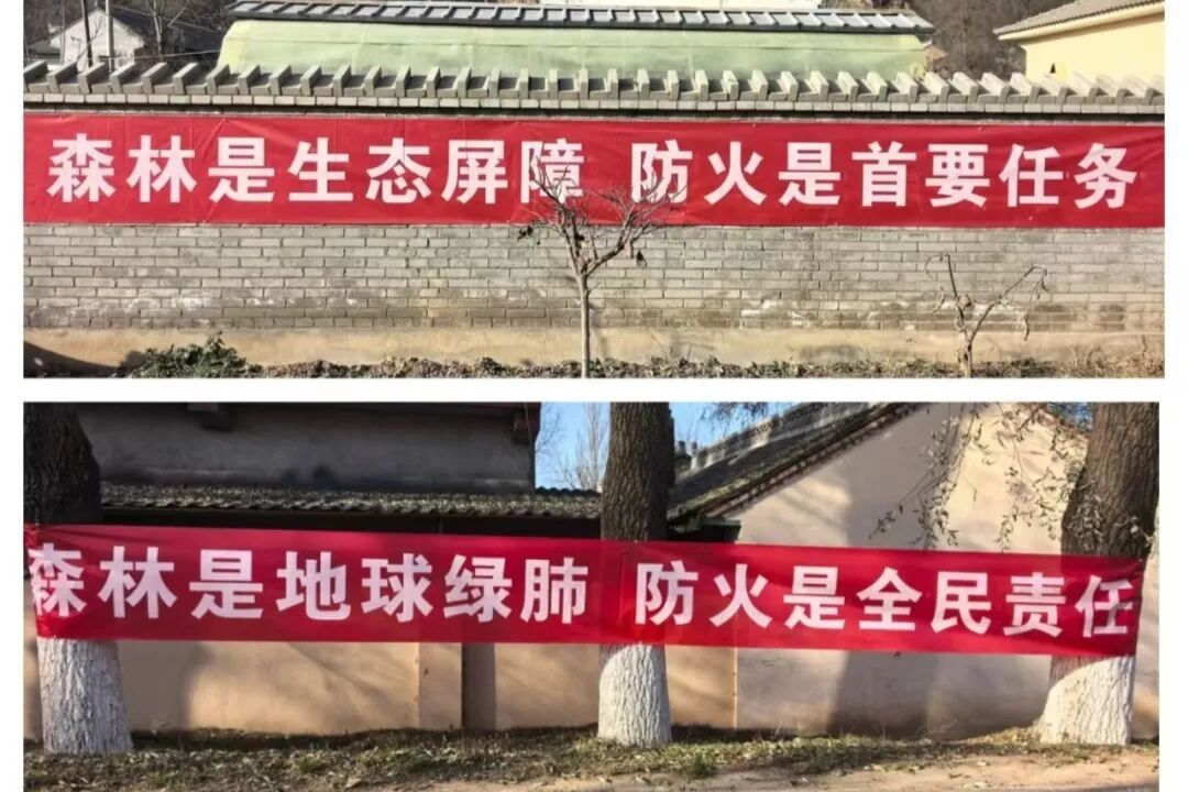 横幅标语亮警示:在乡道村路、林区入口、村委会周边等醒目位置,悬挂宣传标语60多条,张贴禁火令138处,让防火警示抬头可见、驻足能闻、时时警醒。