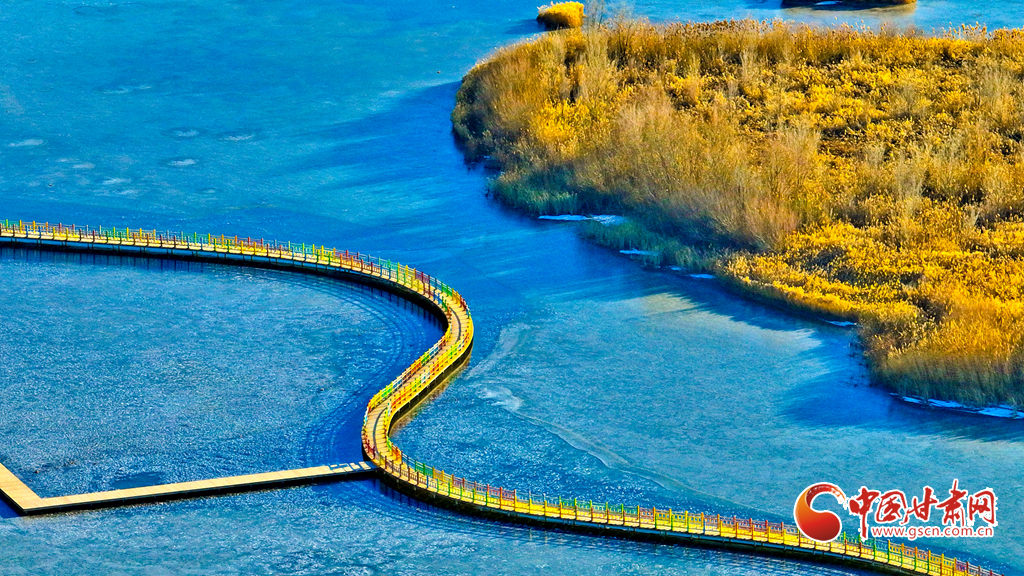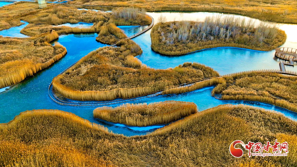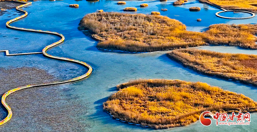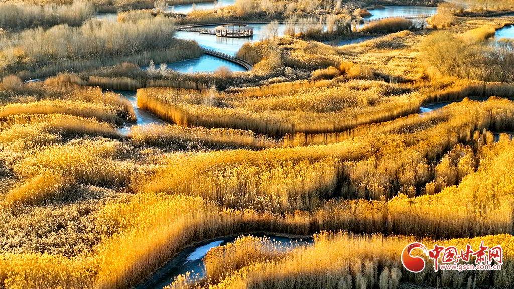 12月4日,张掖市黑河湿地国家级自然保护区内,经风霜浸染的芦苇与蒲草披上金装。从高空俯瞰,夕阳下的芦苇荡如金色海洋,芦花随风轻舞,碧水凝冰环绕其间,宛如一幅铺展的湿地金画卷,吸引众多游客与摄影爱好者前来观赏拍摄。