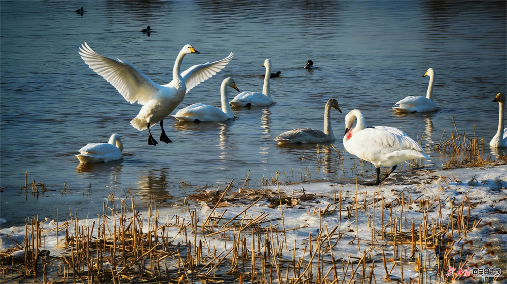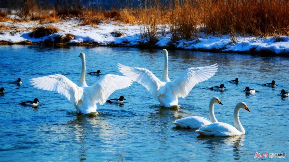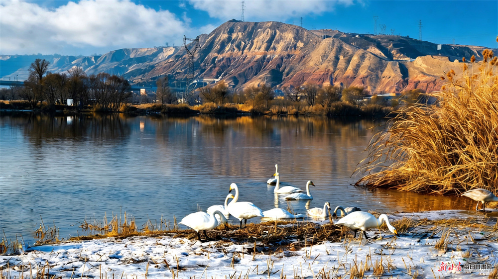 初冬的兰州市西固区达川镇三河口湿地,水面澄澈如镜,芦苇随风摇曳。一群洁白的大天鹅如约而至,或在水中嬉戏游弋,或在岸边梳理羽毛,时而引颈长鸣,为这片黄河交汇处的湿地增添了十足生机。