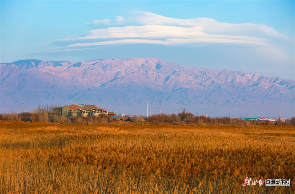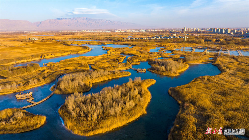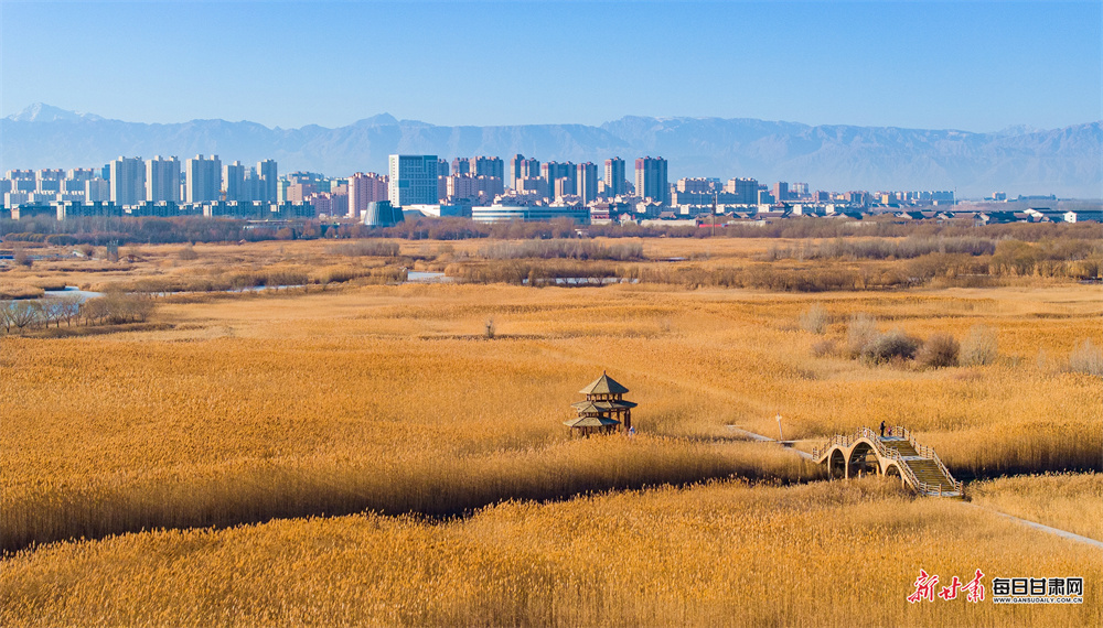 待到夕晖晚照,落日的余晖为湿地镀上一层暖金,苇丛、碧水、禽鸟与远处的建筑勾勒出一幅灵动秀美的生态画卷,尽显张掖湿地冬日独有的生态魅力与诗意风情。