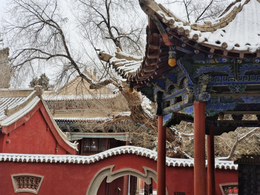 远处传来《凉州词》童声朗诵,一群放学的孩子从门口踏雪走过,红领巾跃动,像一簇簇跳动的火焰。笑声撞碎在古墙,回声里竟有古筝清越。一半厚重,一半鲜活;一半积雪,一半春芽。