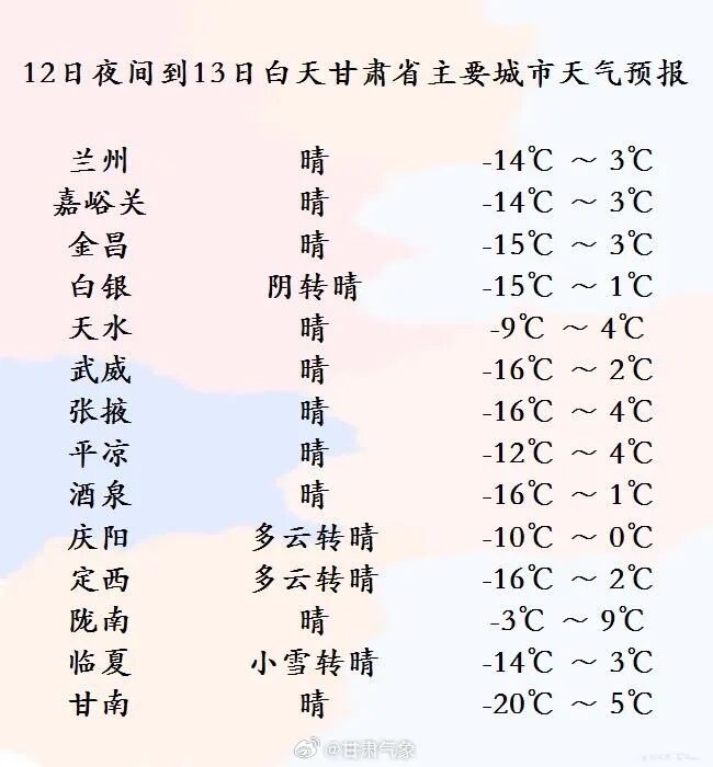 12月12日夜间至13日清晨,受强冷空气和晴空辐射降温影响,全省大部气温继续下降,其中陇南部分地方及陇中、陇东局部地方下降8至10℃,局地可达10℃以上。12月13日至14日,全省大部将转为晴或多云天气。