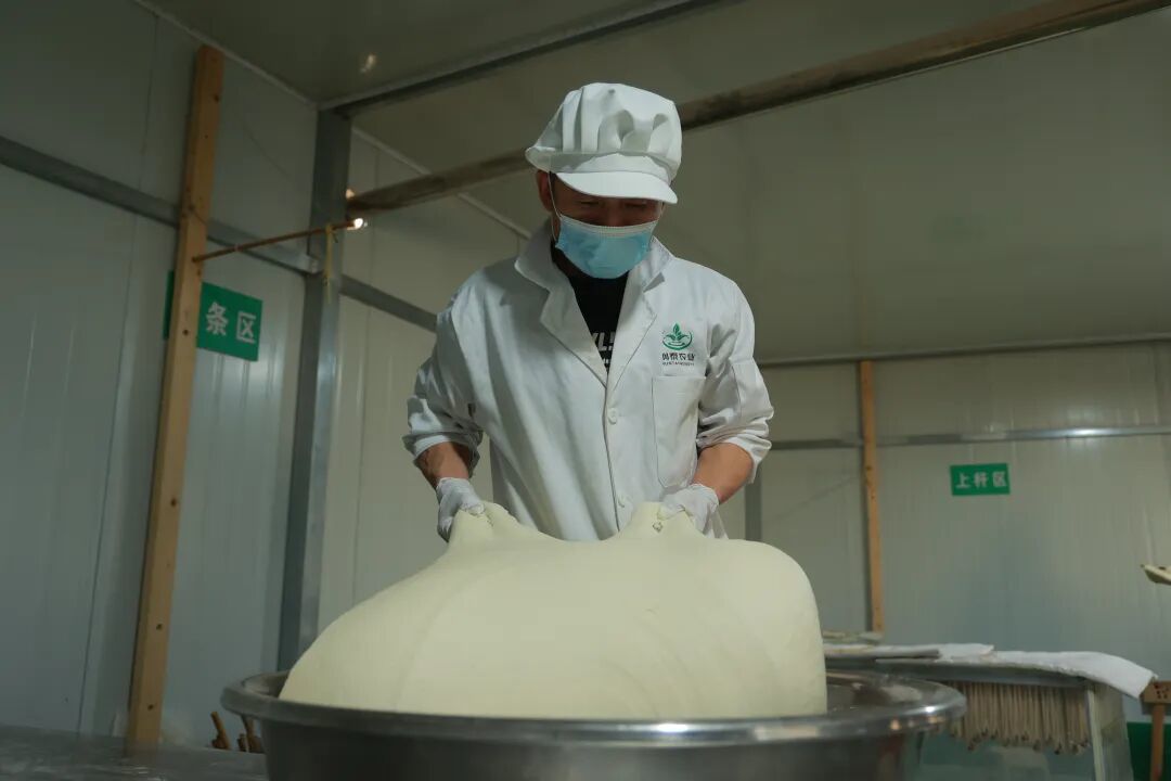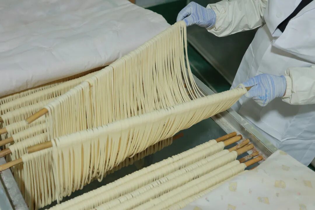 选用本地优质小麦粉,只加食用盐、食用碱和山泉水,经揉、压反复打磨,直至面团“熟而不透,韧而柔软”,让面筋充分延展,再经盘条、搓条,最后一圈圈缠上长筷,轻轻一拉,挂面细如发丝,却韧如银丝,在阳光下泛着温润的光泽,成为此刻乡村里最治愈的风景线。据负责人介绍,目前工厂日产挂面五百余斤,品质稳定、口感劲道。