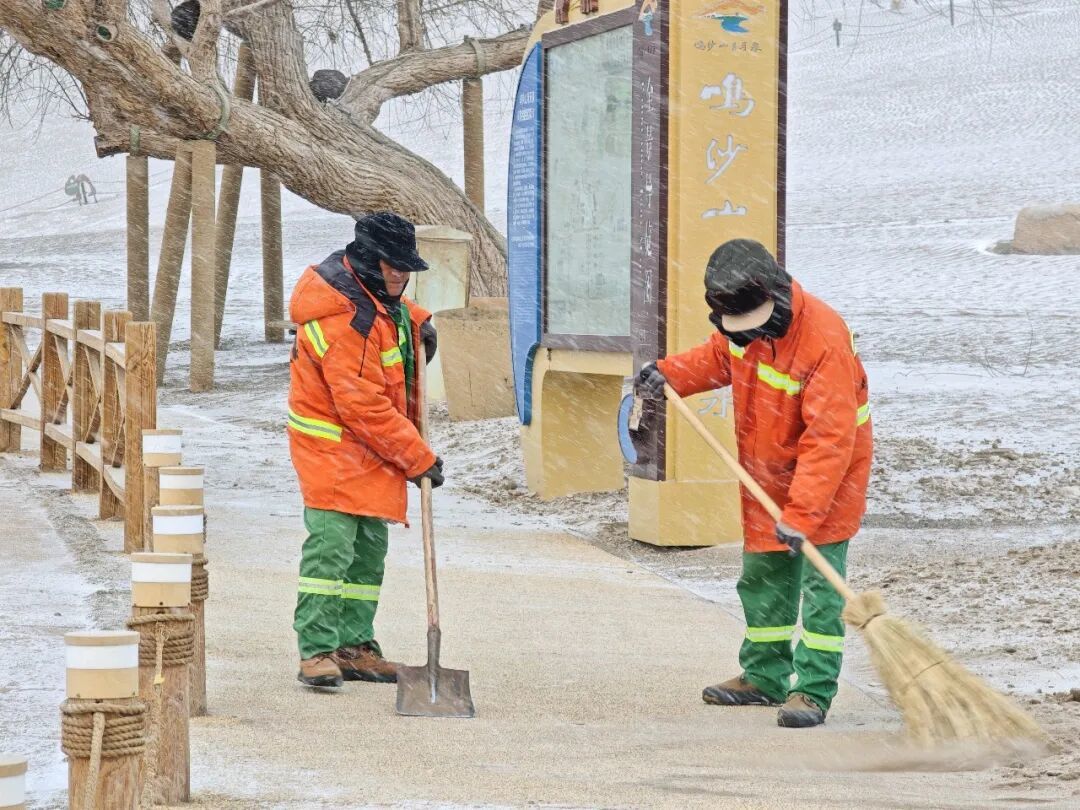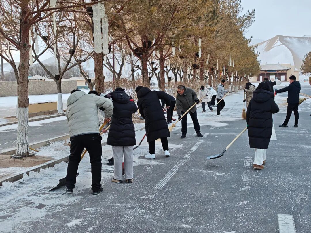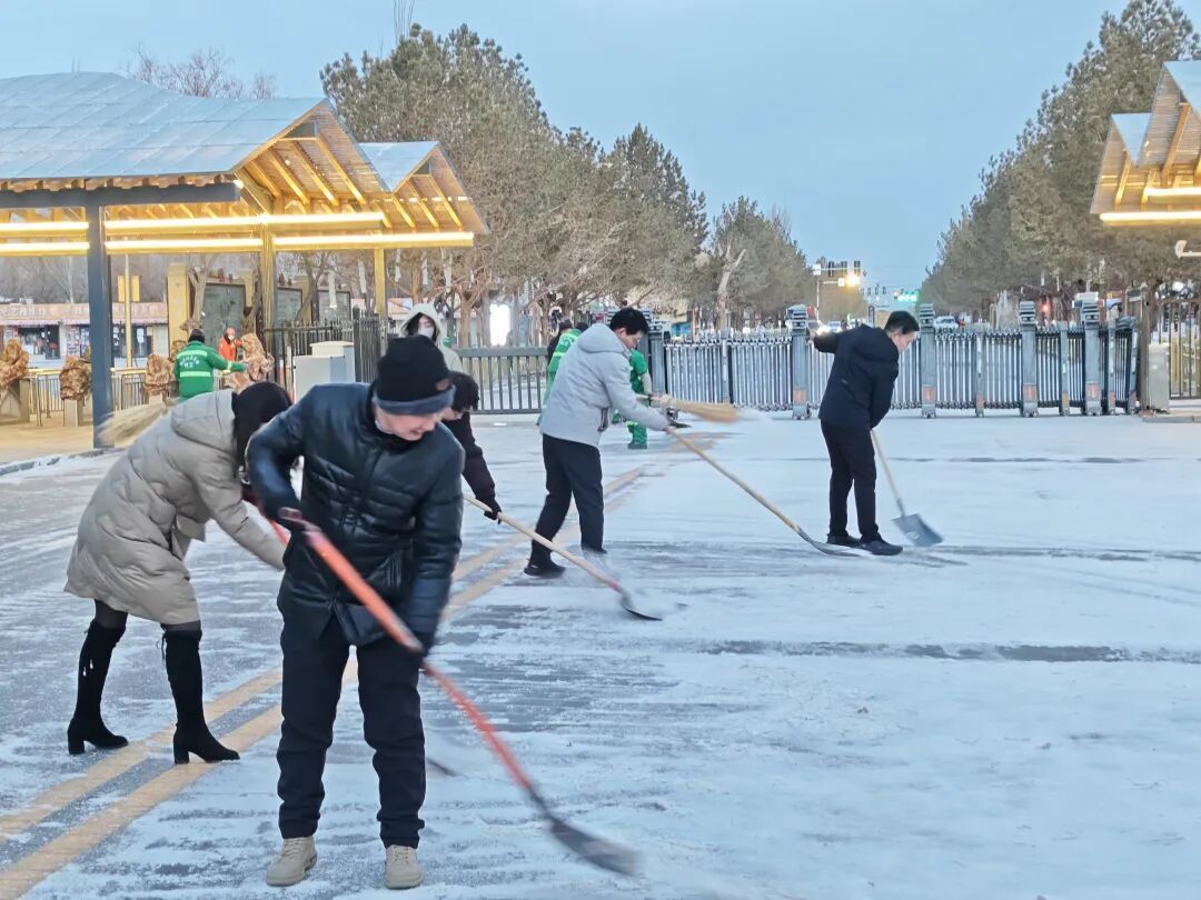 为保障游客游览安全,让大家能安心赏景,景区全体工作人员闻雪而动,迅速投身到扫雪除冰的行动中。山门广场、游览步道、入口通道……处处可见工作人员忙碌的身影。凛冽寒风未减分毫热情,铁锹与扫帚碰撞出清脆声响,大家分工协作、铲扫并举,热火朝天的干劲驱散了冬日寒意,经过一番奋战,景区内的道路被清扫得干干净净,一条安全畅通的游览之路在皑皑白雪中延伸,为游客的赏景之旅筑牢了安全防线。