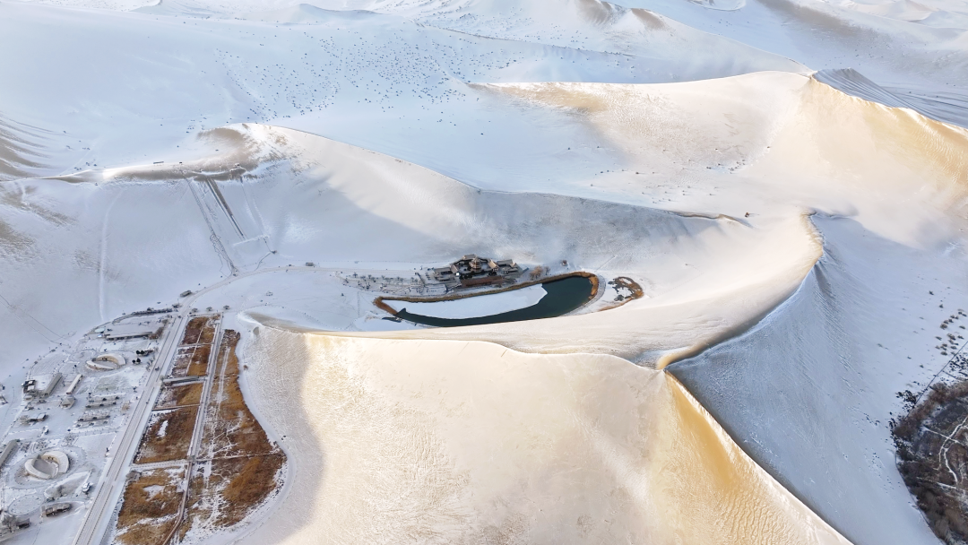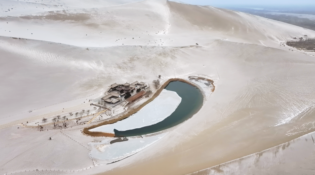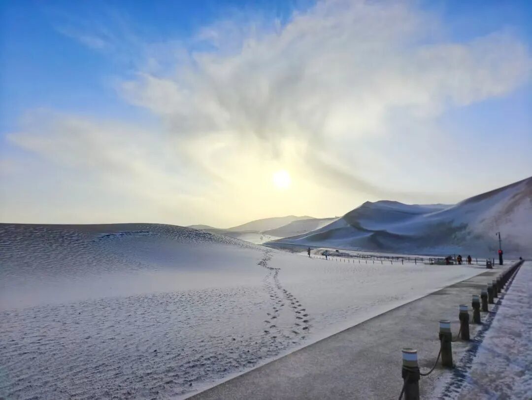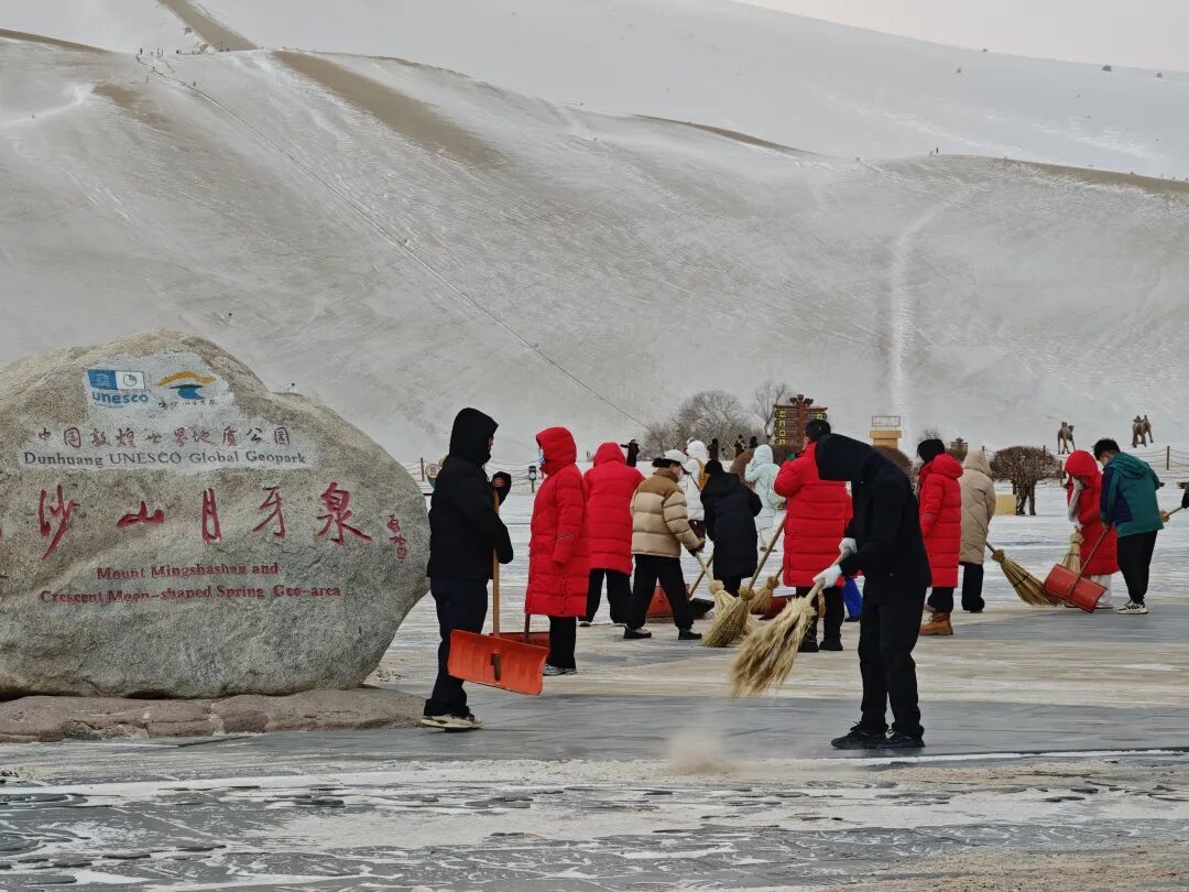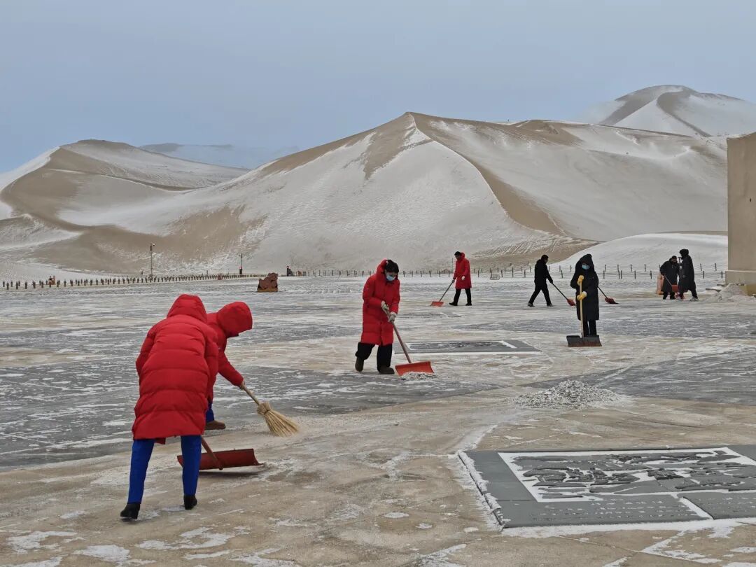 12月12日,鸣沙山月牙泉迎来了别样的冬日盛景。纷飞大雪为大漠披上银装,造就了“沙雪共生”的绝美画卷,引得八方游客纷至沓来,踏雪追景,沉醉其间。