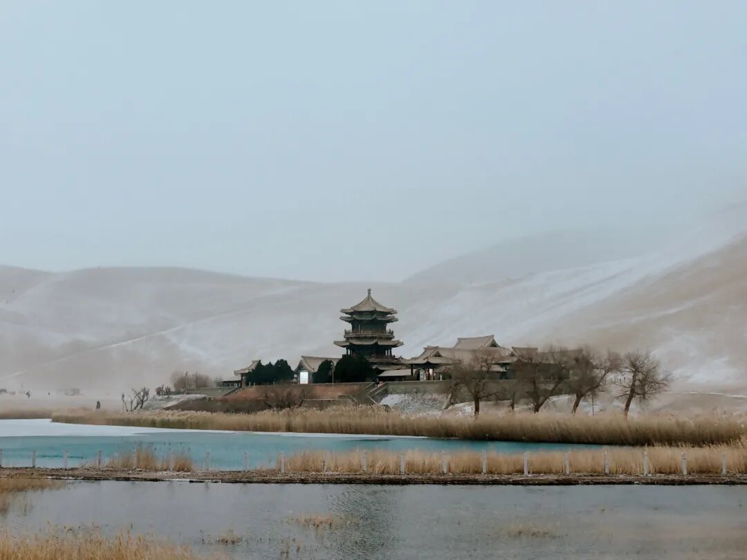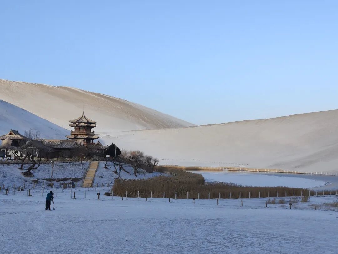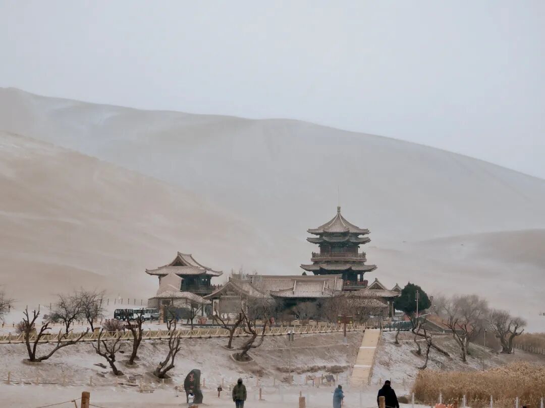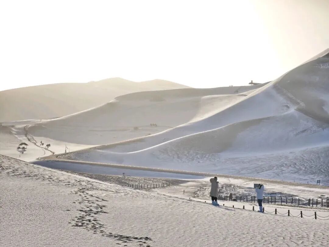 游客们漫步其间,不时发出阵阵惊叹,或驻足拍照,或俯身轻触沙上积雪,尽情感受沙漠雪景的独特魅力。天地间褪去了缤纷色彩,归于一片纯净的雪白,仿佛时间在此刻凝结,喧嚣被风雪轻轻掩埋,只余下鸣沙山最厚重、最静谧的韵味。