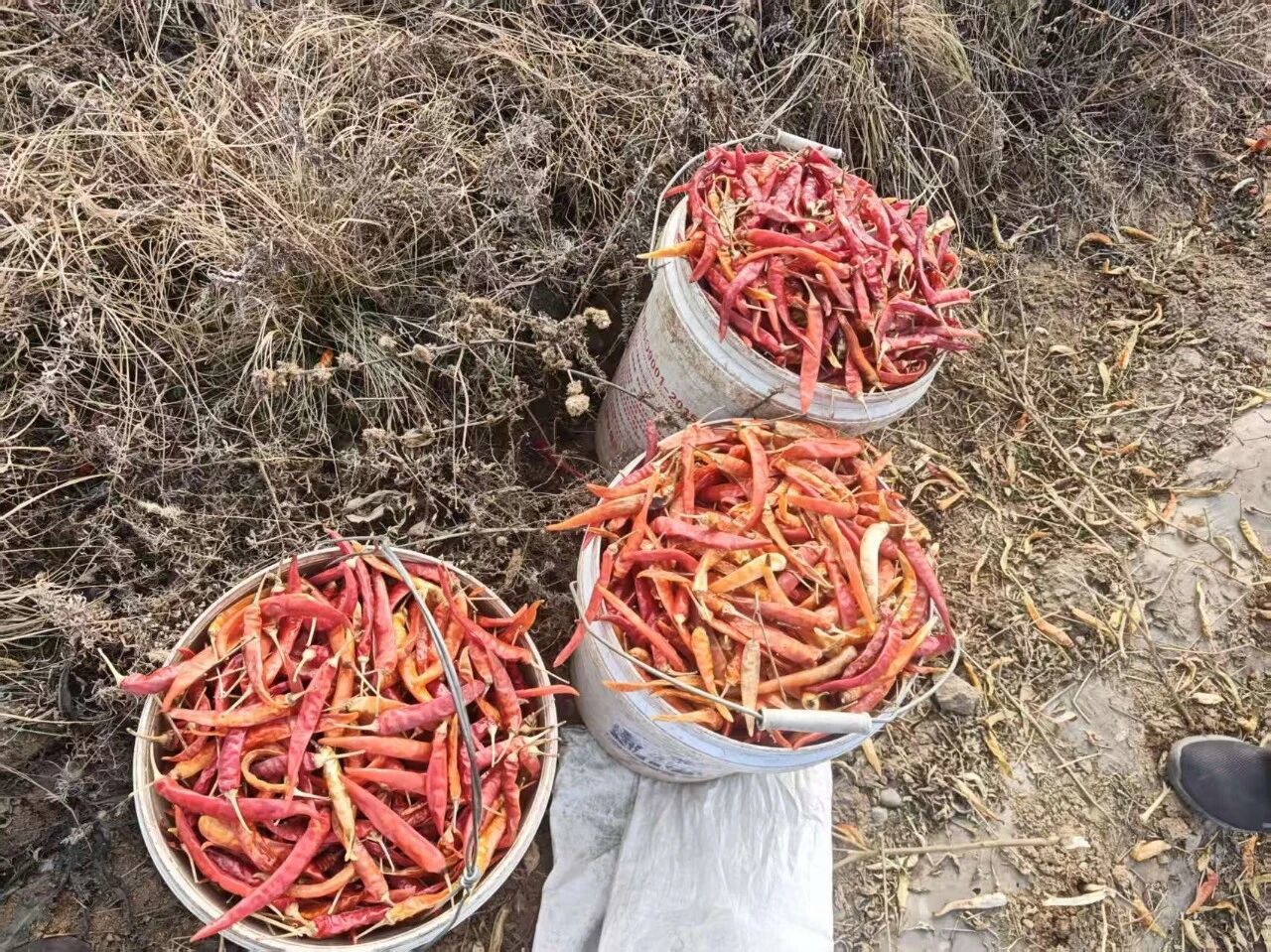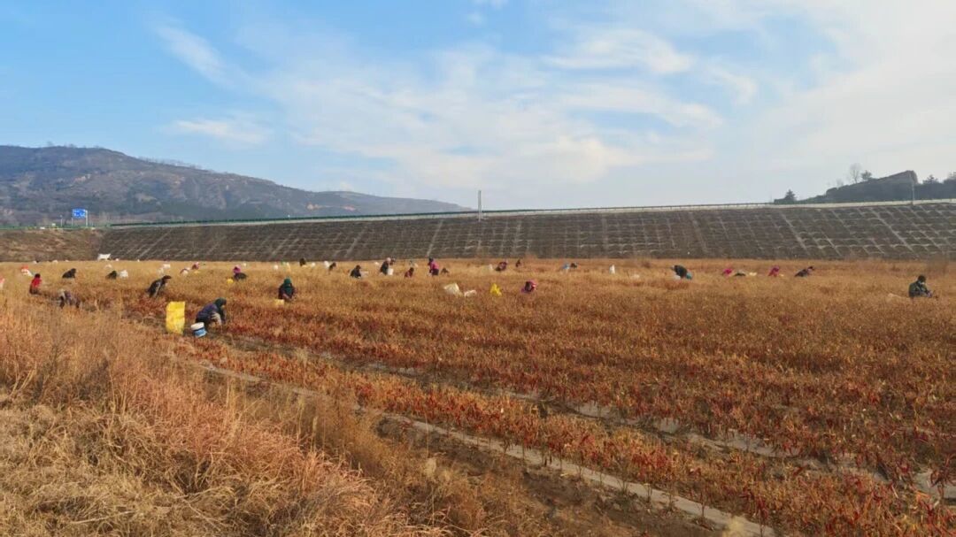 在采收现场,农户们头戴保暖帽、手提水桶,弯腰穿梭在整齐的椒垄间,指尖麻利地掐下成熟的朝天椒,不一会儿就装满一桶。大家分工明确,有的专注采摘、有的负责转运、有的集中装袋,红亮的辣椒在田间堆成小丘,再由车辆运往收购点。60余名劳动者的身影在200亩椒田里错落分布,欢声笑语伴着采摘的簌簌声,构成了一幅冬日丰收的鲜活图景。