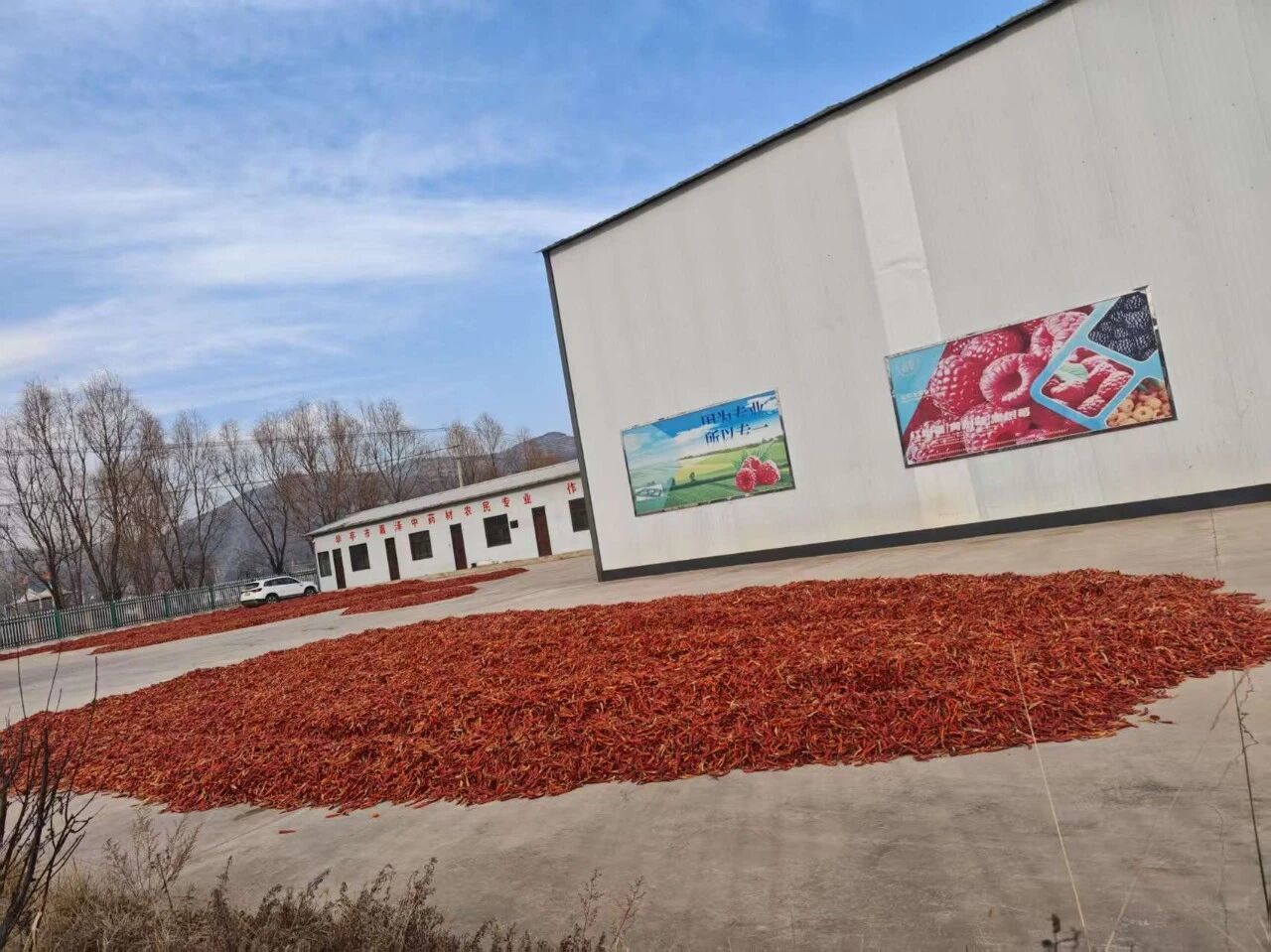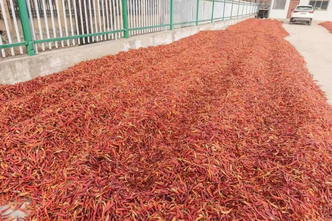 在采收完成后,辣椒的晾晒环节同样重要。农户们将运送回来的朝天椒均匀摊开在晒场上,借助冬日干爽的阳光与微风,让辣椒自然脱水干燥。阳光下,红通通的辣椒铺满场地,宛如一片红色的海洋,成为策底镇又一道独特的冬日风景。