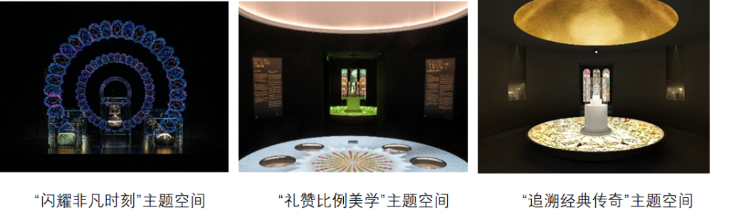 “工艺臻境”展厅则分三个篇章,深度解构品牌的灵感宇宙。“闪耀非凡时刻”中,古董晚宴手袋与当代全新珠宝手袋对话,聚焦高定时装之美;“礼赞比例美学”以沉浸式投影,将佛罗伦萨圣母百花大教堂的穹顶线条与珠宝盒上精妙的几何雕刻相连,揭示建筑与金匠艺术的血脉渊源;“追溯经典传奇”通过灵感源于古罗马文物的Boscoreale系列杯作,展现品牌对远古文明与古典艺术的深切敬意。