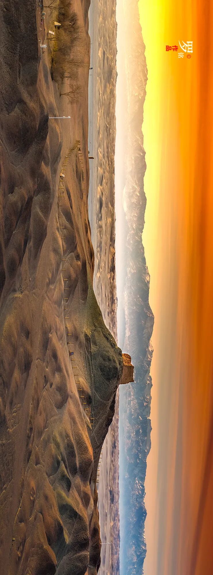 绯红、橙金、淡紫……天空化作流动的调色盘,烽燧的剪影在绚烂背景中凝成一道倔强的墨线。镜头捕捉的,是云霞与历史的共舞:恍若听见驼铃轻响,那是时空交错时,霞光为古道谱写的无言诗篇。