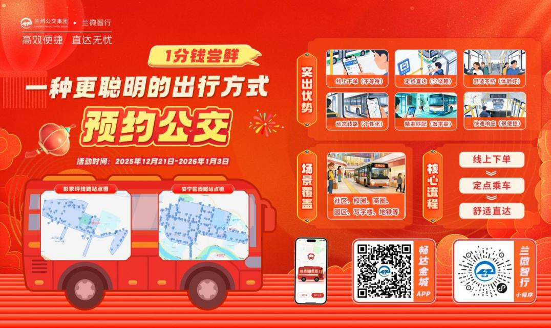 为深入贯彻落实“十五五”规划关于加强普惠性、基础性、兜底性民生建设,按照全兰州市综合交通大会战工作部署,兰州公交集团聚焦市民乘客个性化、定制化需求,定于12月21日起,在安宁和彭家坪两个区域试点开通“兰微智行”预约公交服务。“兰微智行”预约公交突破了传统公交“固定线路、固定班次”的固态化运营模式,针对社区接驳、校园通勤、就医出行、商圈购物等个性化出行场景,提供灵活高效的“点对点、门对门”精准便捷出行解决方案。
