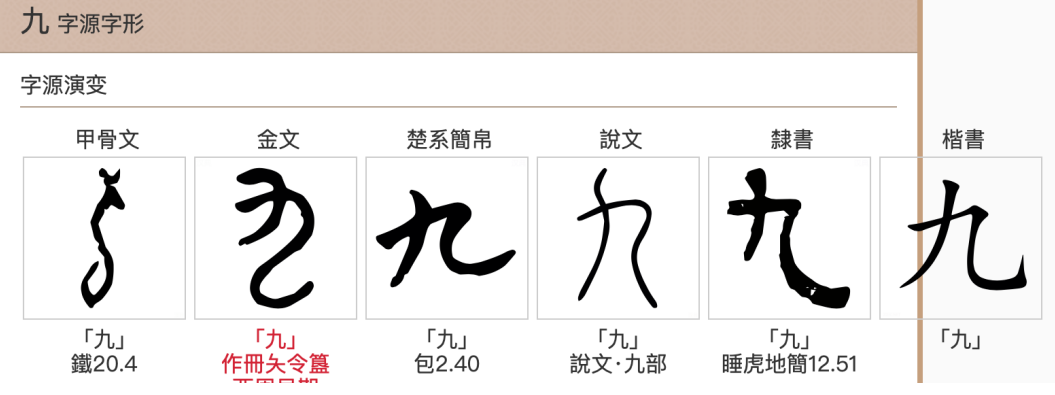 陽之變也。象其屈曲究盡之形。凡九之屬皆从九。舉有切《说文解字》