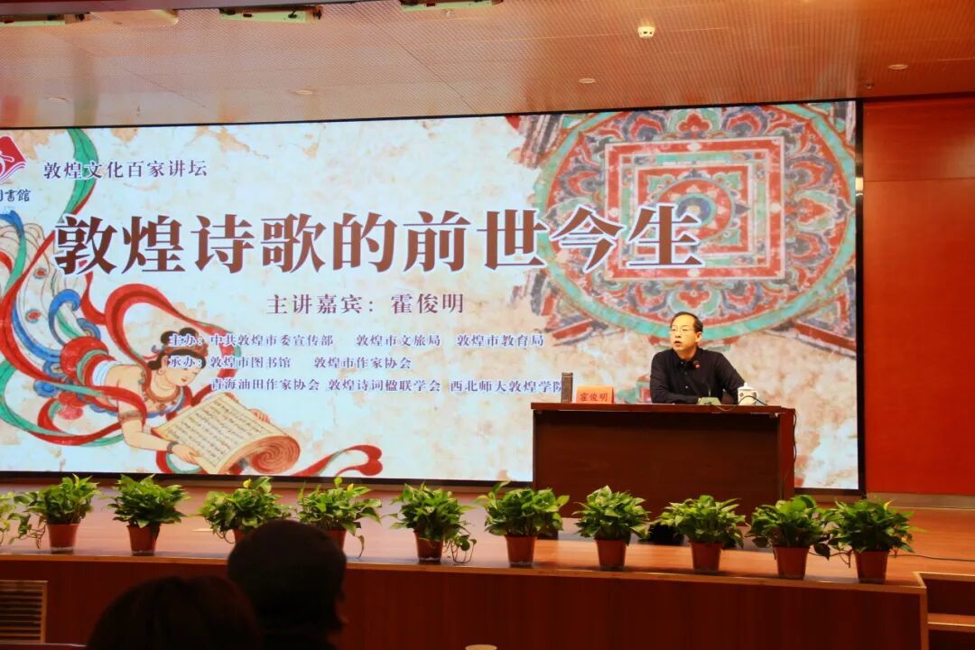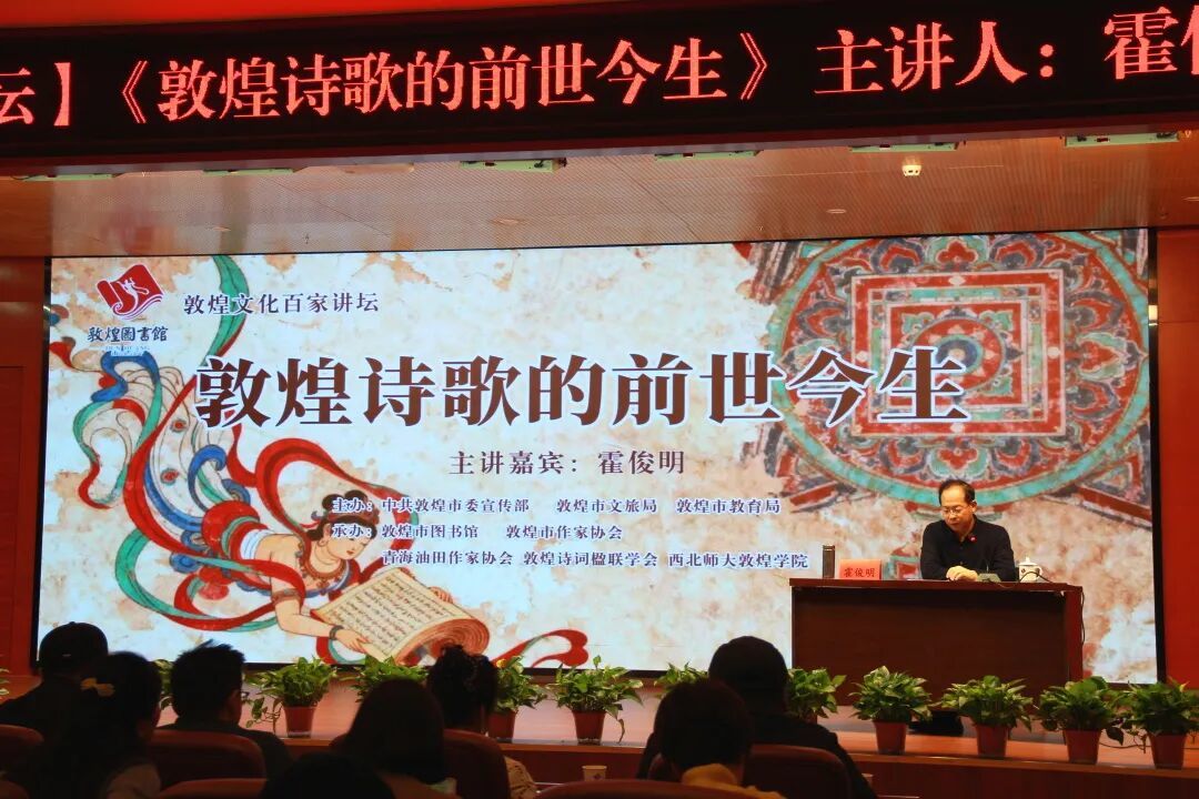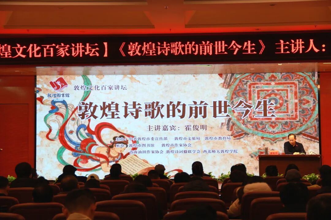 12月20日上午,由中共敦煌市委宣传部、敦煌市文旅局、敦煌市教育局主办,敦煌市图书馆、敦煌市作家协会、青海油田作家协会、敦煌市诗词楹联学会、西北师大敦煌学院承办的“敦煌诗歌的前世今生”专题讲座在敦煌市图书馆报告厅举办,本次讲座特邀著名诗人、评论家、北京师范大学博士后、中国作协《诗刊》社副主编、编审霍俊明担任主讲嘉宾。敦煌市、青海油田读者,驻敦某部官兵及敦煌学院师生共计200余人参加了当天的活动。