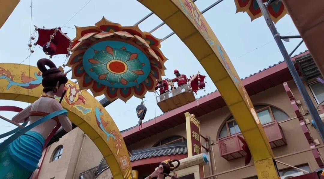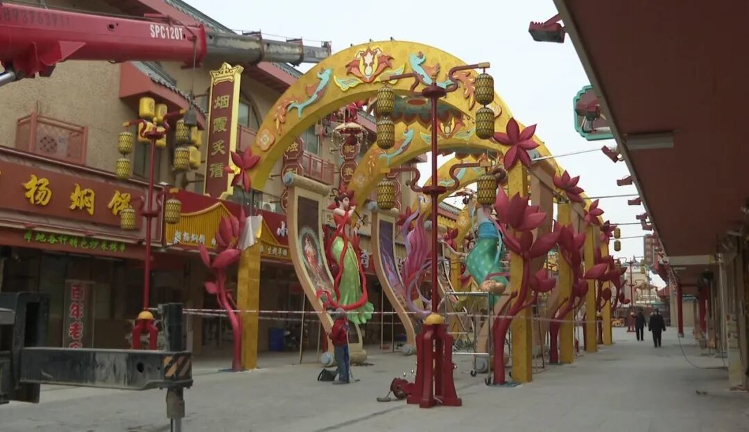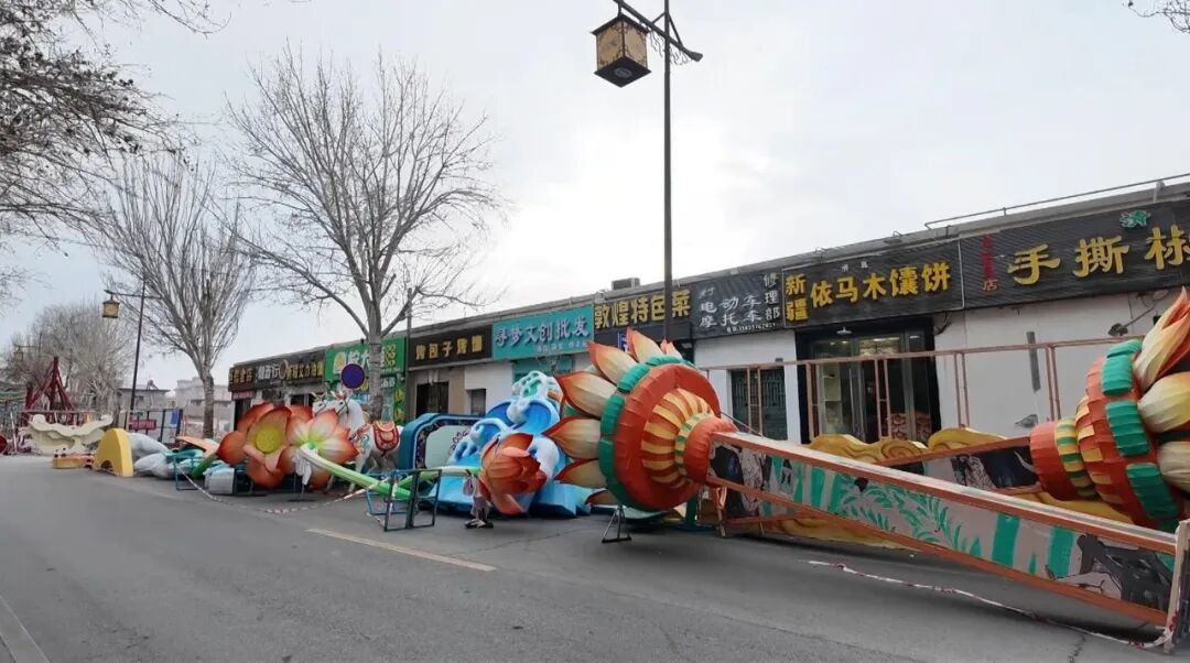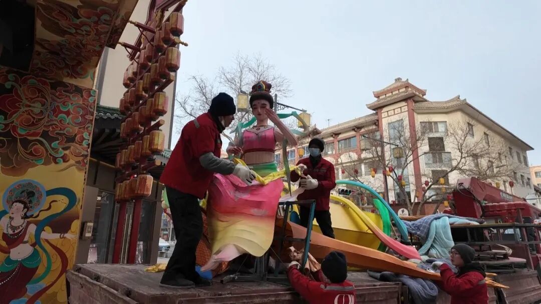 12月21日,“千年华彩・盛世敦煌”2026敦煌灯会已进入灯组摆放与调试的冲刺阶段。在敦煌夜市的筹备现场,工人们正有条不紊地进行成品灯组的精准定位、安装固定,一盏盏承载着敦煌文脉的花灯渐次“站稳脚跟”。其中,衣袂翻飞的飞天造型栩栩如生,部分大型灯组已初显真容,那些源自壁画的卷草纹、宝相花等经典敦煌纹样,在自然光线下依旧线条细腻、层次分明,尽显匠心巧思与艺术张力。