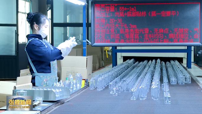 在甘肃富地金虹玻璃制品有限公司生产车间里,经过 1600摄氏度高温熔化的玻璃液,在自动化流水线上被制成晶莹剔透的香水瓶,工人们正在仔细检验成品质量。