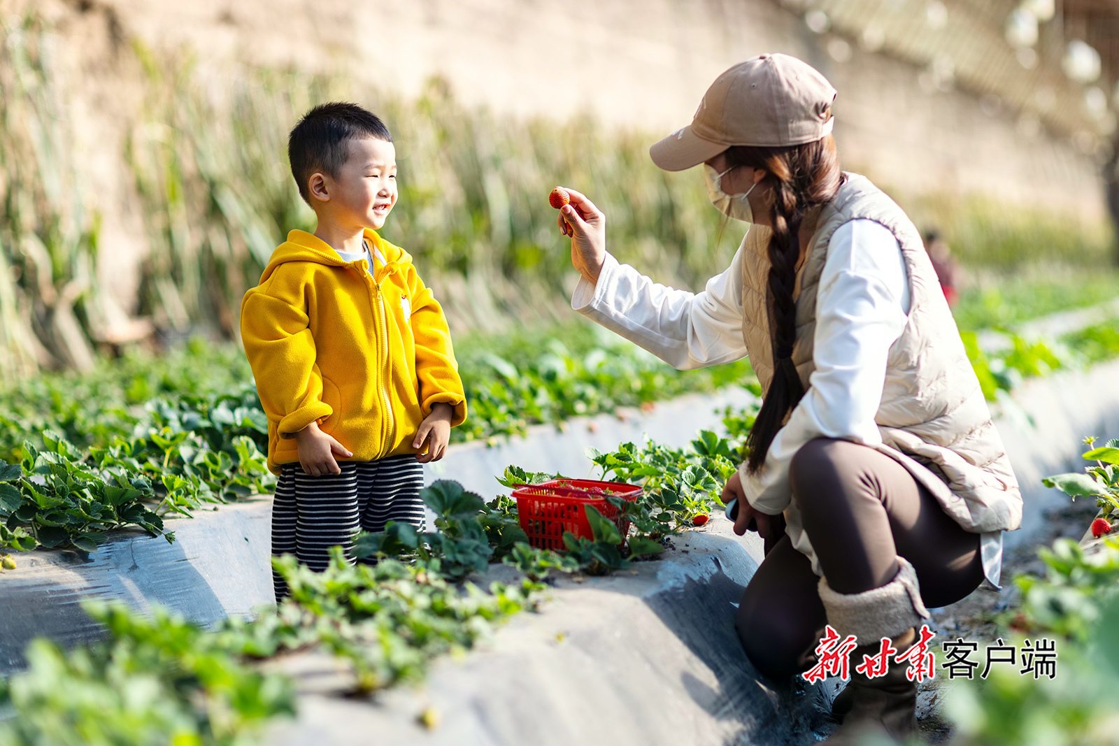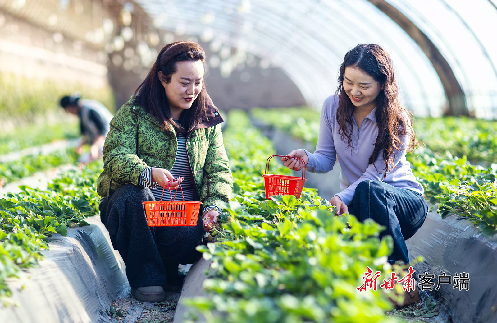 12月20日,张掖市甘州区长安镇庄墩村万通采摘园内,游客正在采摘草莓和火龙果。