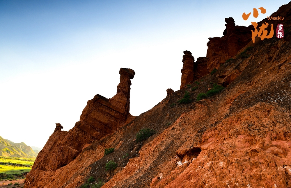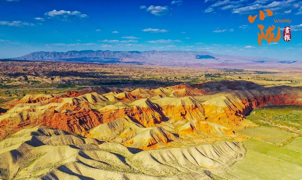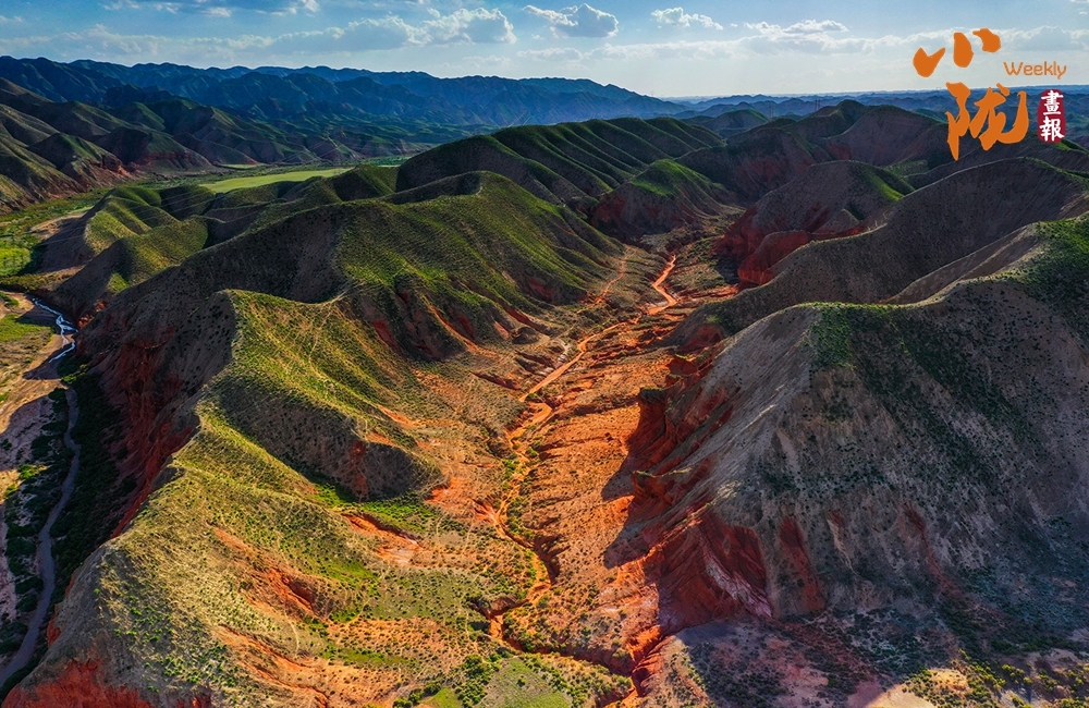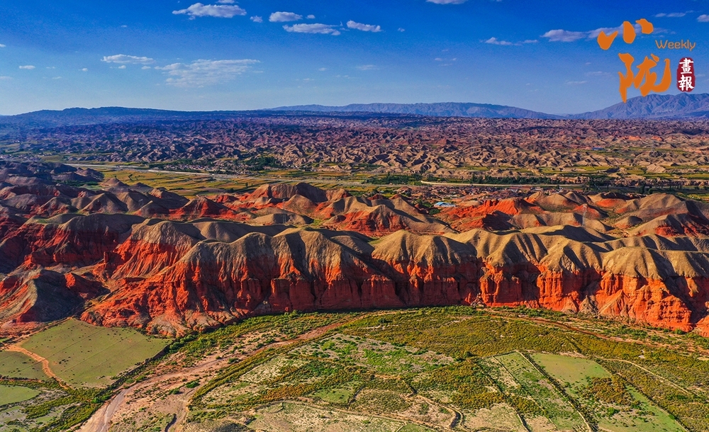 极目远眺,丹霞丘陵在广袤的黄土高原上奔腾不息,犹如一座座火焰山。朱砂红如烈焰燃烧,赭石黄似大地厚土,青黛绿若幽谷深潭,间或夹杂着沉稳的灰褐,共同编织出一种难以言喻的斑斓与和谐。