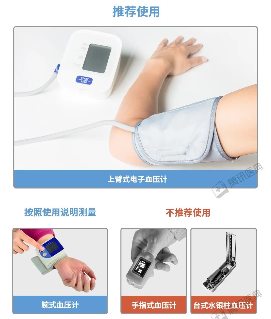 不建议使用台式水银柱血压计和手指式血压计。(可以收藏下面这个图)