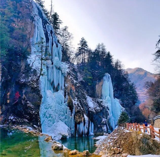踏入官鹅沟大景区,往日灵动的湖泊凝成琉璃镜面,澄澈的冰面下,水草的纹路清晰可见,仿佛定格了一整个秋天的温柔。