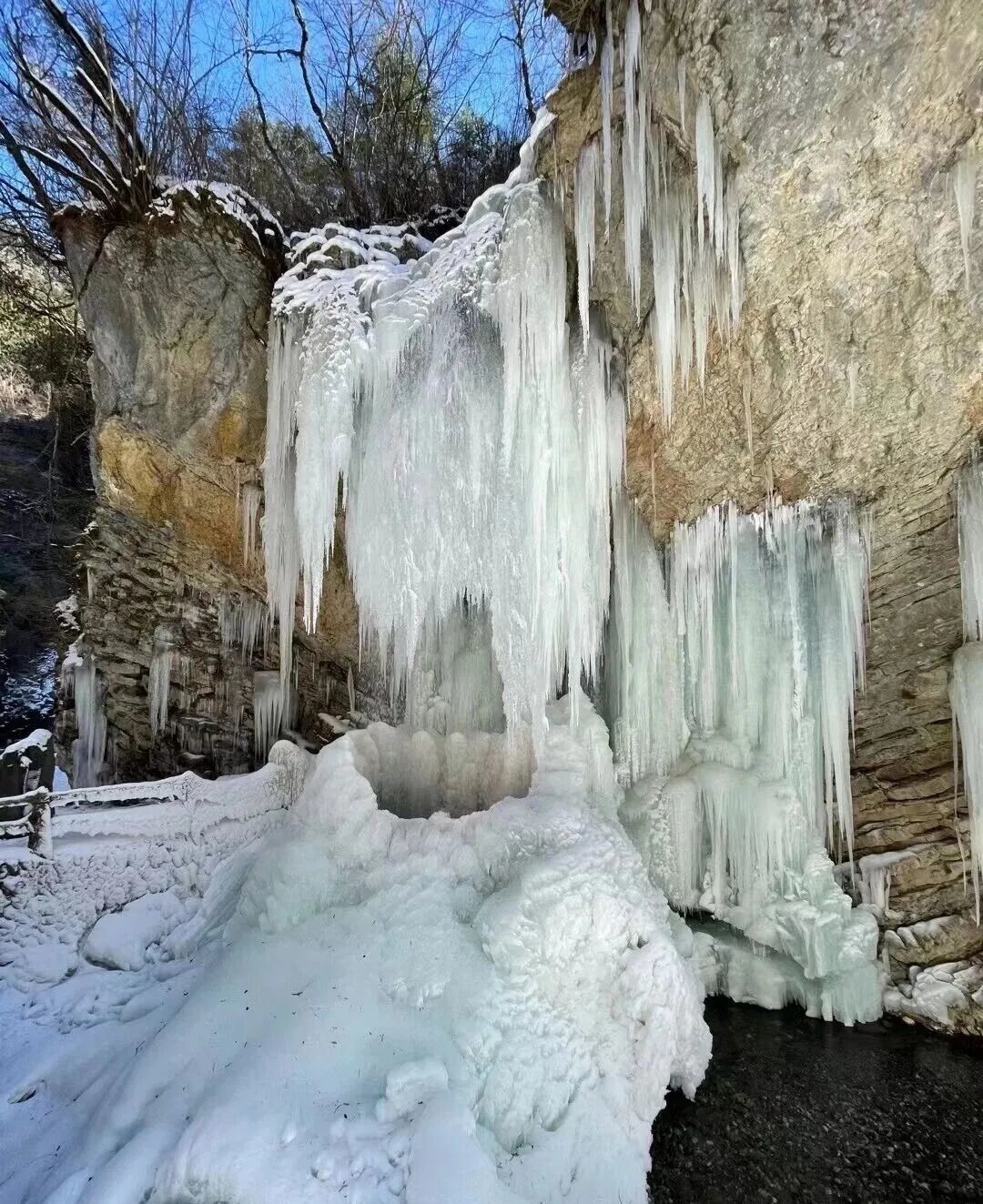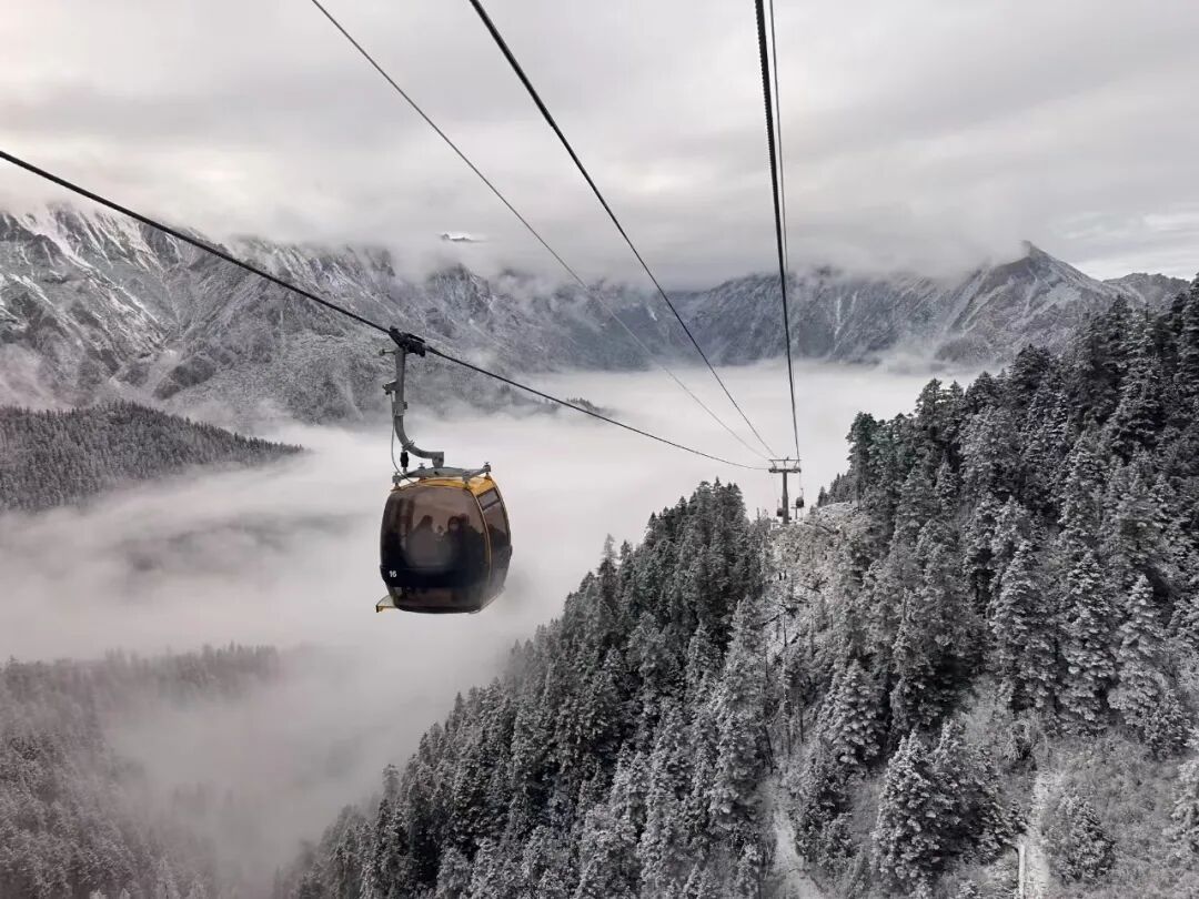 飞泻的瀑布褪去喧嚣,化身冰瀑奇观,层层叠叠的冰棱垂挂崖壁,在阳光的折射下泛着细碎银光,玉树琼花、冰雕玉砌,一步一景皆是仙境。乘索道缓缓登顶,云海翻涌间邂逅雾凇林海,千树万树银装素裹,枝头的冰晶随风轻晃,宛如童话里的冰雪世界,干净得不像话,随手一拍都是无需滤镜的冬日大片。