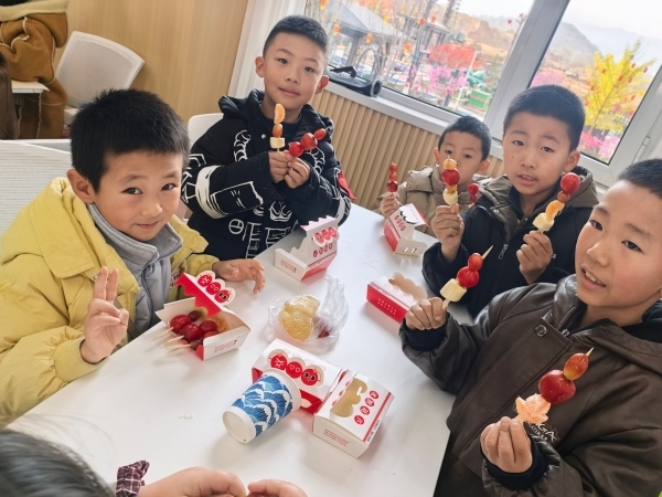 实操环节正式开启,孩子们瞬间化身“小小美食家”,纷纷行动起来。有的孩子专注地挑选水果,将红彤彤的山楂和娇艳的草莓搭配串成串,创意十足;有的孩子围在熬糖锅旁,目不转睛地盯着糖浆的变化,生怕错过最佳裹糖时机;还有的孩子互相帮忙,你递竹签我拿水果,在协作中拉近彼此距离。当一串串裹着晶莹糖衣的糖葫芦制作完成时,孩子们迫不及待地品尝起来,酸甜的果香混合着浓郁的糖味在口腔中散开,大家的脸上都洋溢着满足与自豪的笑容。