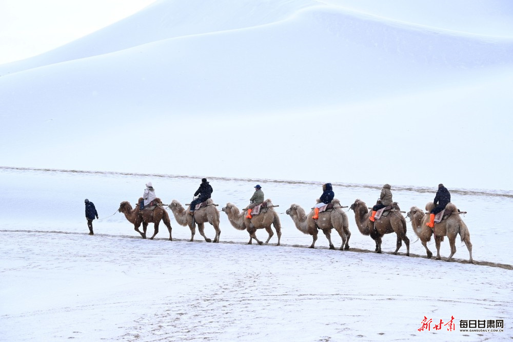 雪中的鸣沙山、月牙泉更添几分静谧诗意,莫高窟的飞檐斗拱覆雪而立,尽显古朴悠远。各地游客踏雪而行,或驻足赏景,或拍照留念,在银装素裹的古城画卷中喜迎2026年的到来。