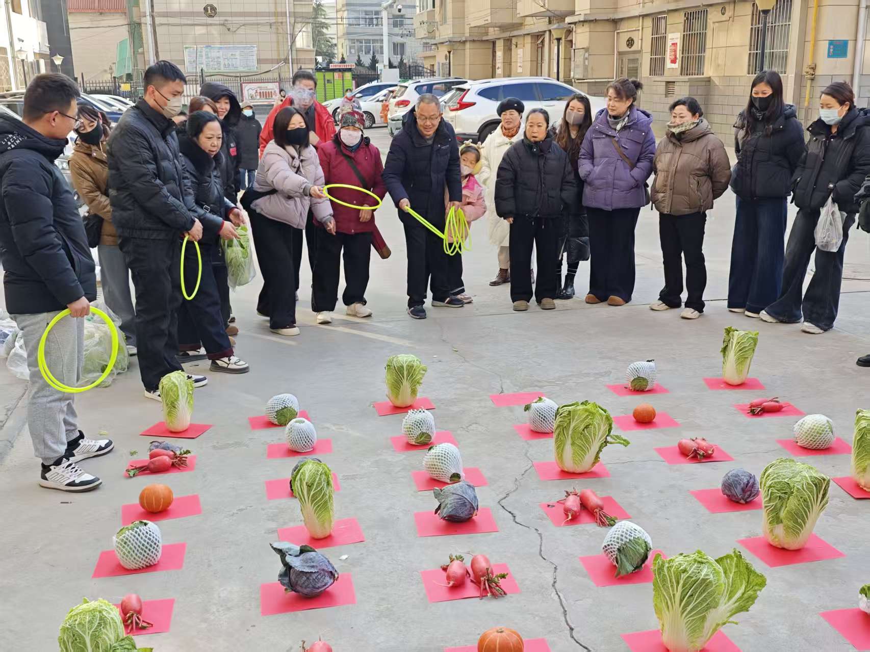 最热闹的当属趣味游戏区的套菜环节。白菜、苹果、橙子、包菜、南瓜、紫甘蓝等新鲜蔬菜整齐排列,每样蔬菜都有着美好的寓意——白菜代表“白财聚来”,苹果象征“平安喜乐”,橙子寓意“心想事成”。工作人员刚把规则讲完,居民们就迫不及待地排起了队。“3、2、1,套!”随着一声呼喊,一个个套圈飞向目标。“中了!中了一棵白菜!”居民陈阿姨兴奋地举起手中的白菜,“既能玩游戏又能拿新鲜蔬菜,社区太贴心了!听说剩下的蔬菜还会送给困难群众,真是温暖又实在。”