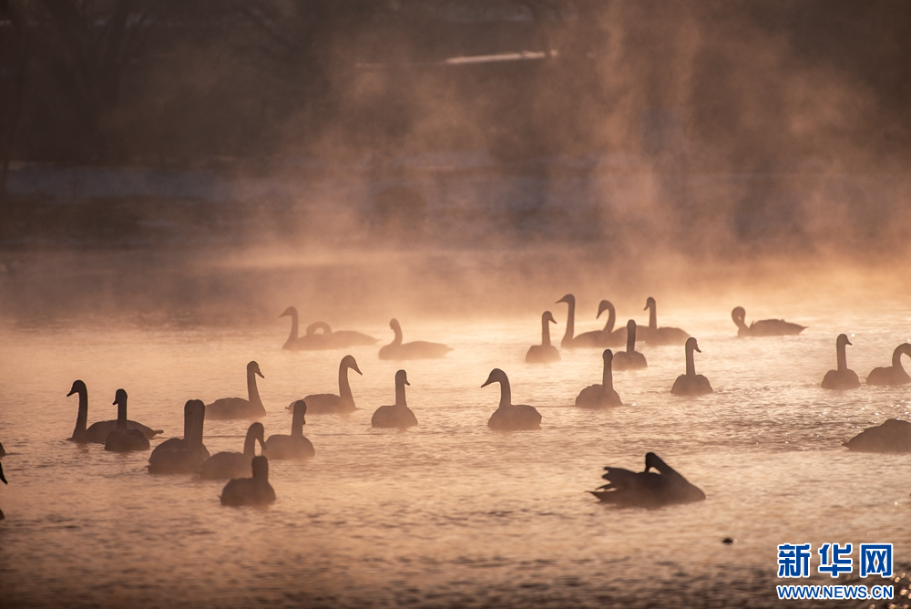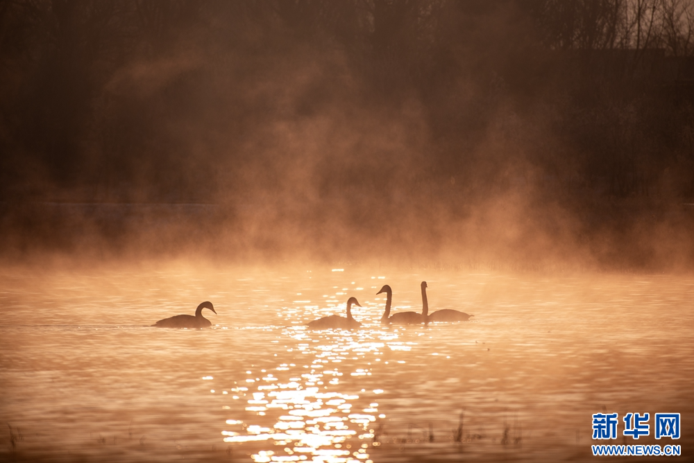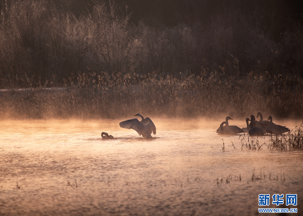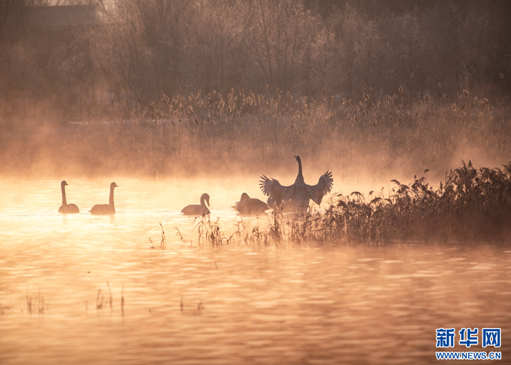 冬日晨光里,甘肃张掖国家湿地公园内,成群的大天鹅游弋觅食。洁白身姿在晨雾中摇曳生姿、翩跹起舞,构成一幅灵动秀美的冬日生态画卷。新华网发(刘旭明 摄)
