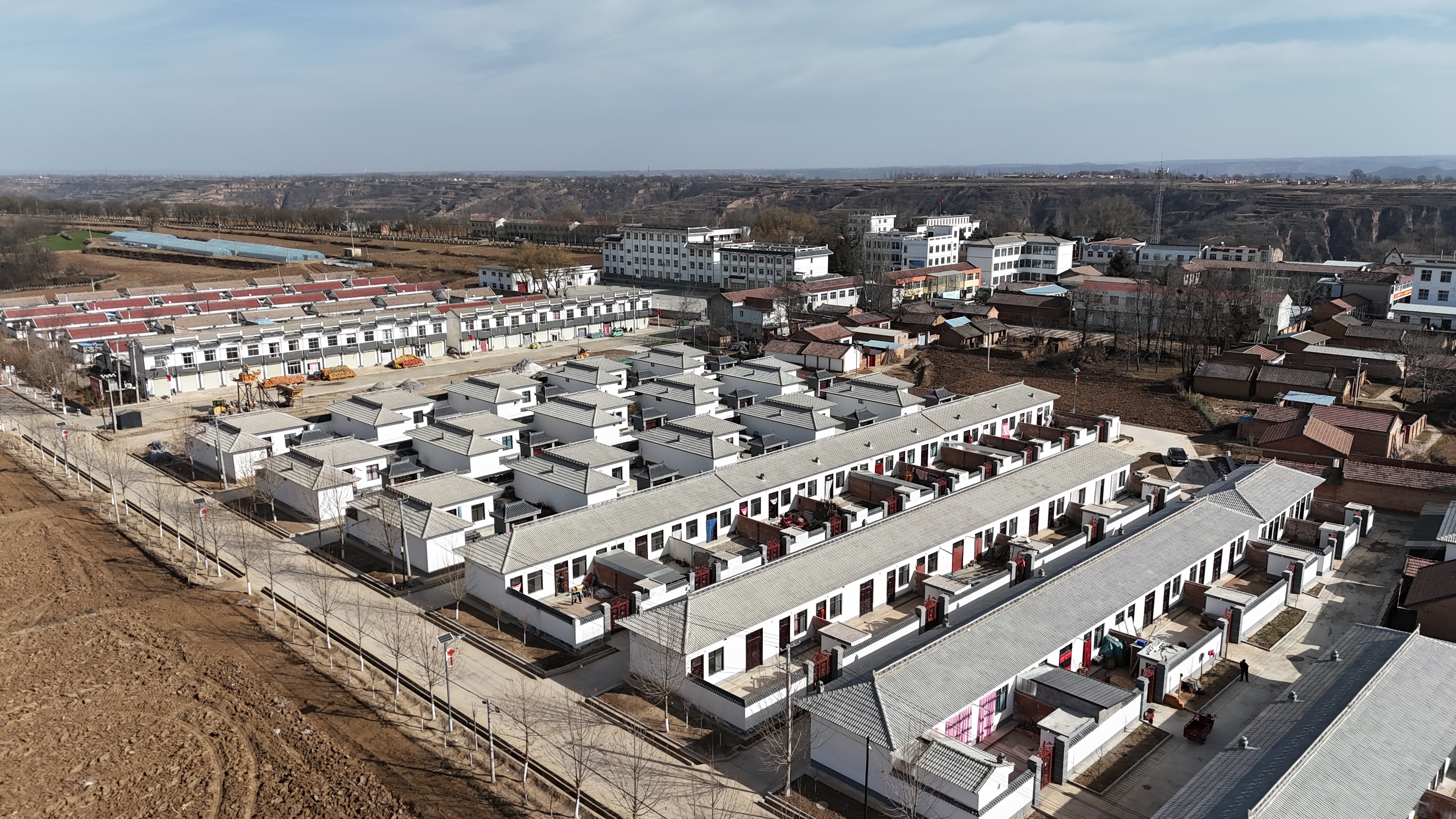 在灵台县蒲窝镇五星村集中安置点,一排排白墙灰瓦的民居整齐矗立,平整开阔的道路纵横其间,水、电、通信等基础设施配套齐全,宜居底色一目了然。