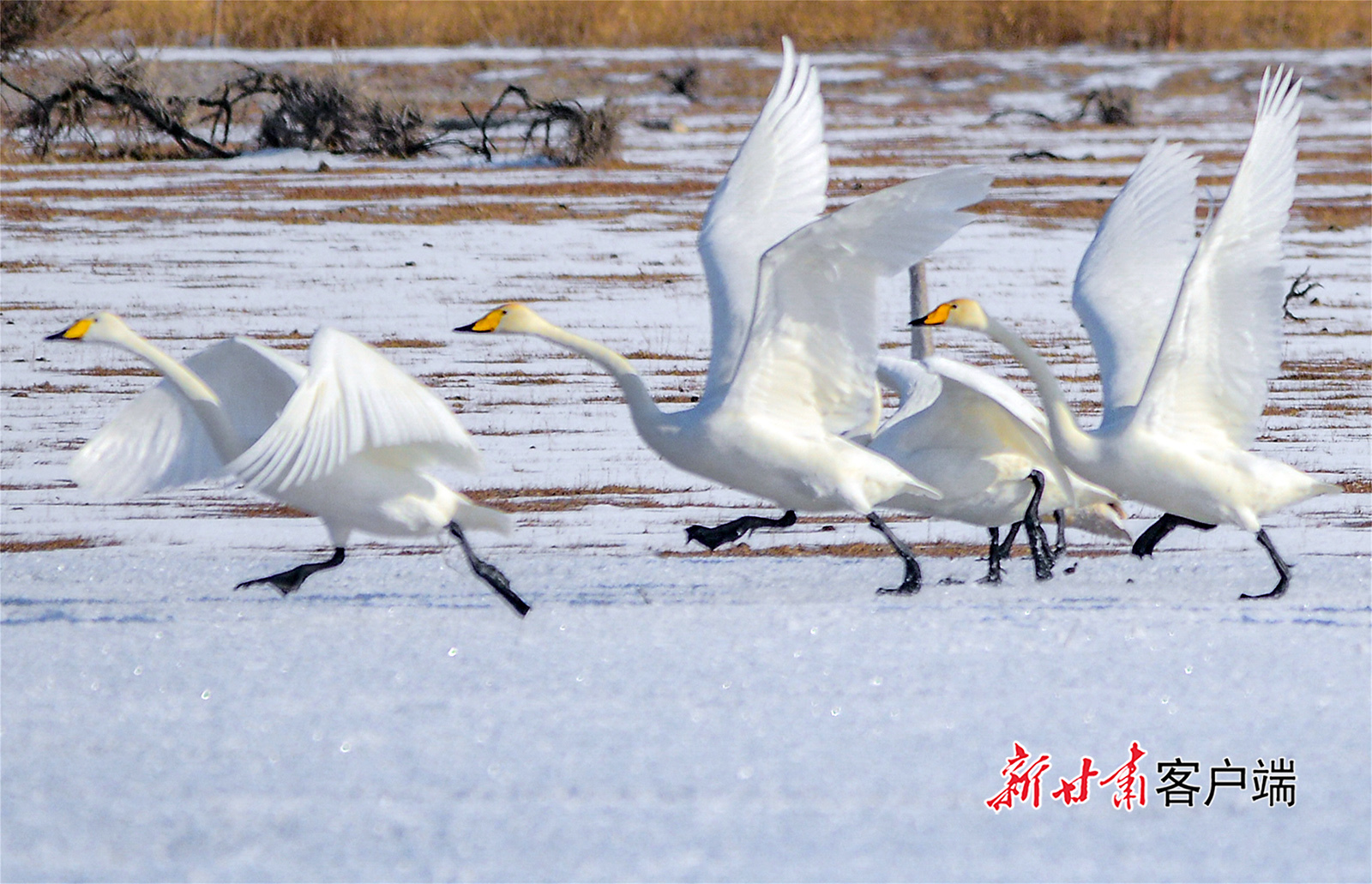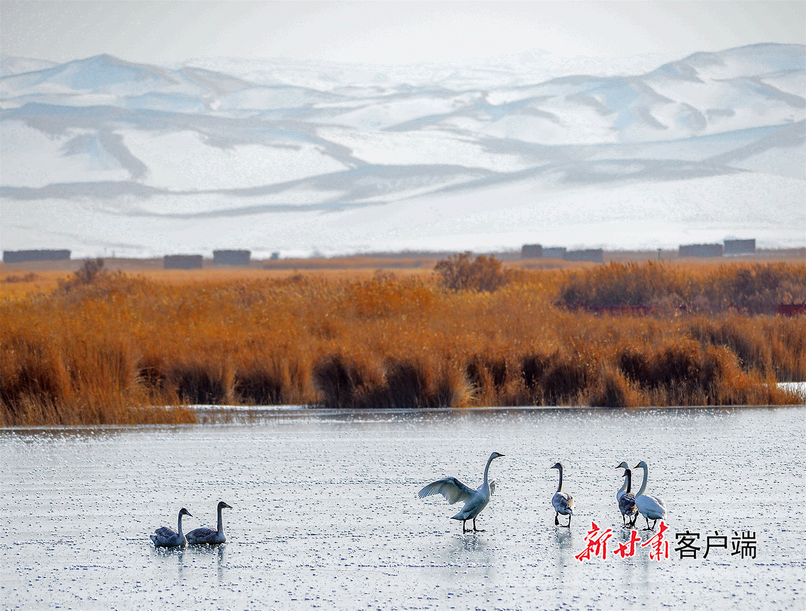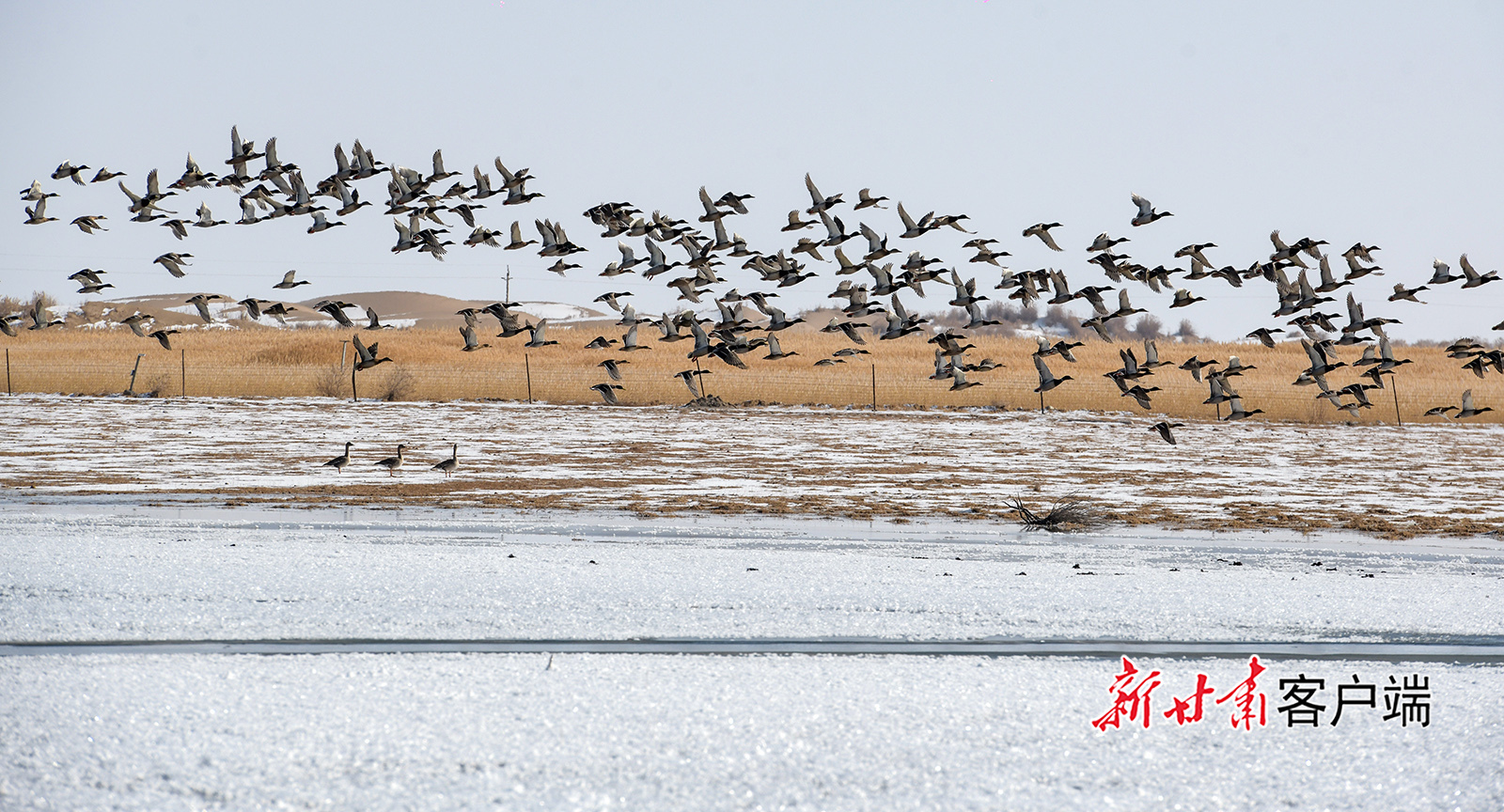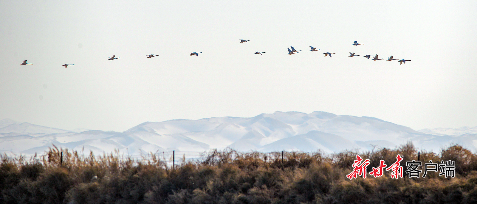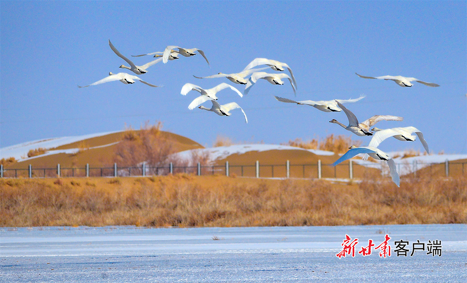 1月2日,敦煌市阳关下的渥洼池栖息的白天鹅、野鸭等鸟类,给冬日的阳关湿地增添了生机和活力。