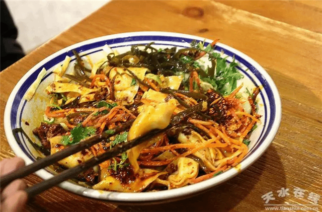 天水麻辣烫——天水“八大碗”——天水暖锅、呱呱、猪油盒、馓饭——甘谷酥圈圈——武山臊子面——清水素扁食——张家川十三花、凉拌乌龙头——秦安酸辣肚丝汤、辣子面