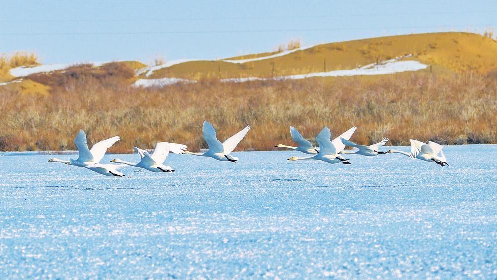 新年伊始,敦煌市阳关脚下的渥洼池畔生机盎然,一群白天鹅翩然而至,勾勒出一幅灵动而宁静的冬日画卷。