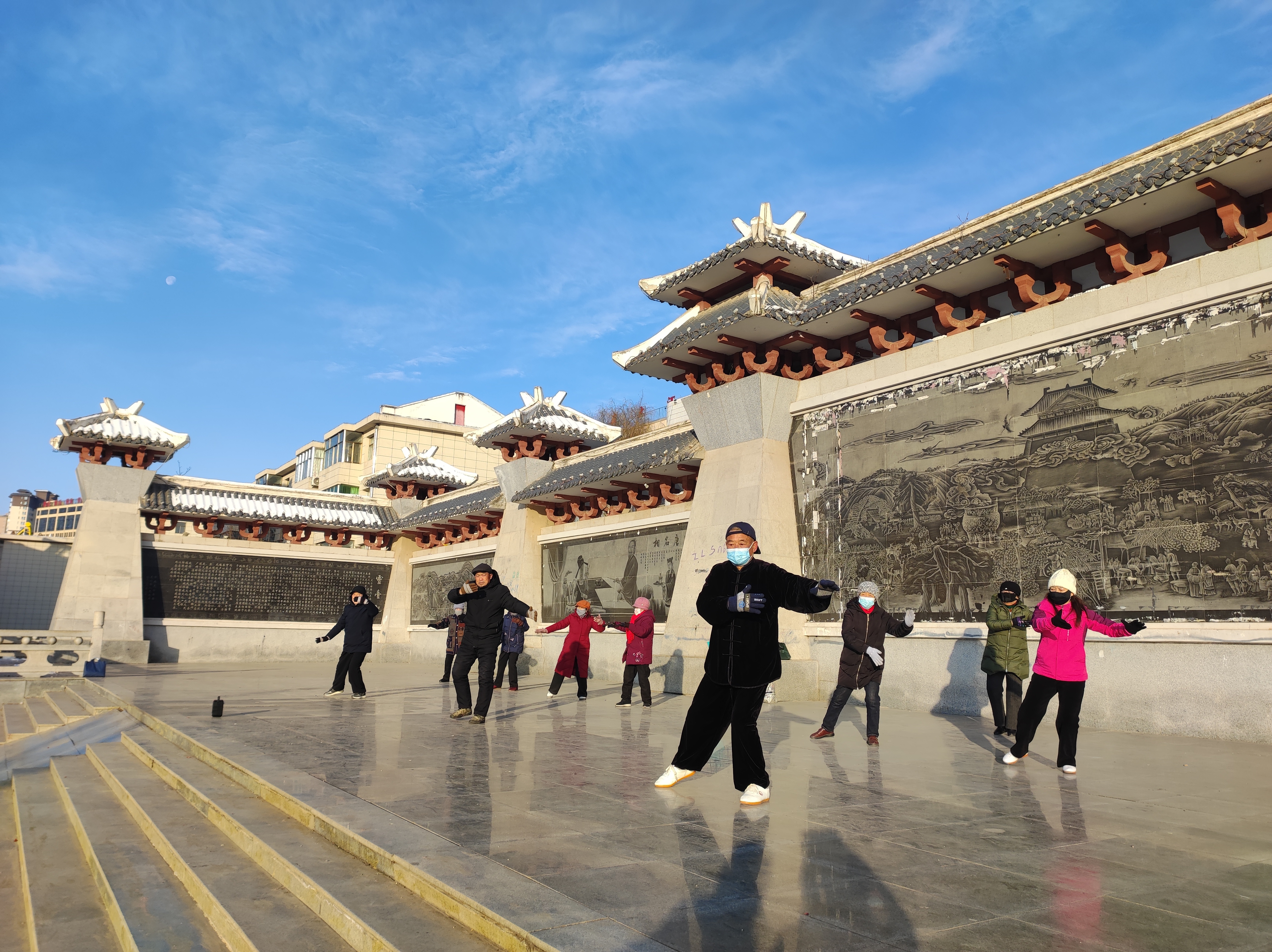 天刚蒙蒙亮,县城各广场便逐渐热闹起来。乒乓球台前,几位大爷早已挥拍对垒,白色小球在球网间飞速穿梭,清脆的撞击声打破了冬日的静谧;篮球场上,有人身着厚实棉服,在场上奔跑、传球、投篮,冻得通红的脸上满是专注;不远处,打太极、练剑的市民伴着舒缓音乐,动作舒展柔和,一招一式尽显从容;羽毛球网前,两两一组的市民挥拍对打,脚步在防滑地面上灵活挪动;健身步道上,晨跑者身影络绎不绝,他们迎着寒风,步伐稳健。
