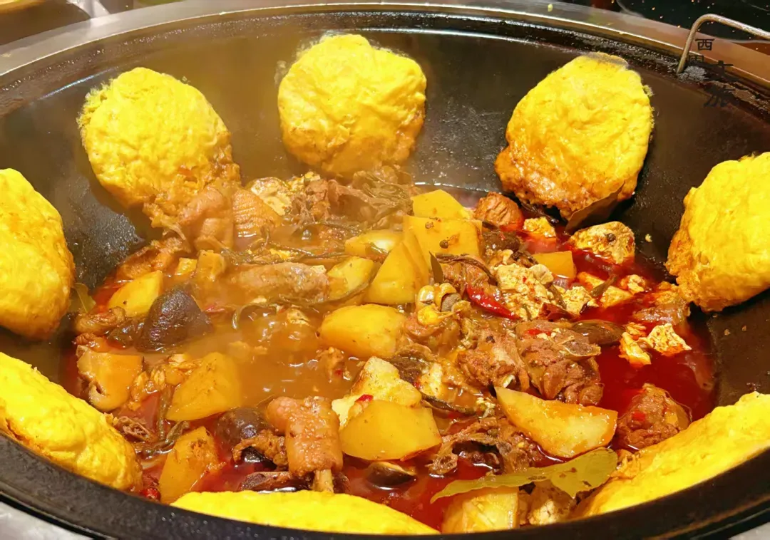 在古镇里的网红农家餐馆,必点现炒现炖的柴火鸡!鸡块在铁锅中翻炒出焦香,加入土豆、玉米等配菜慢炖,咕嘟咕嘟的汤汁裹着鲜嫩鸡肉,最后贴上一圈杂粮面,吸饱汤汁的面皮劲道十足,一口下去全是烟火暖意。推荐试试“老院子柴火鸡”“刘一味柴火鸡”,地道农家风味,是本地人都常去打卡的网红店。