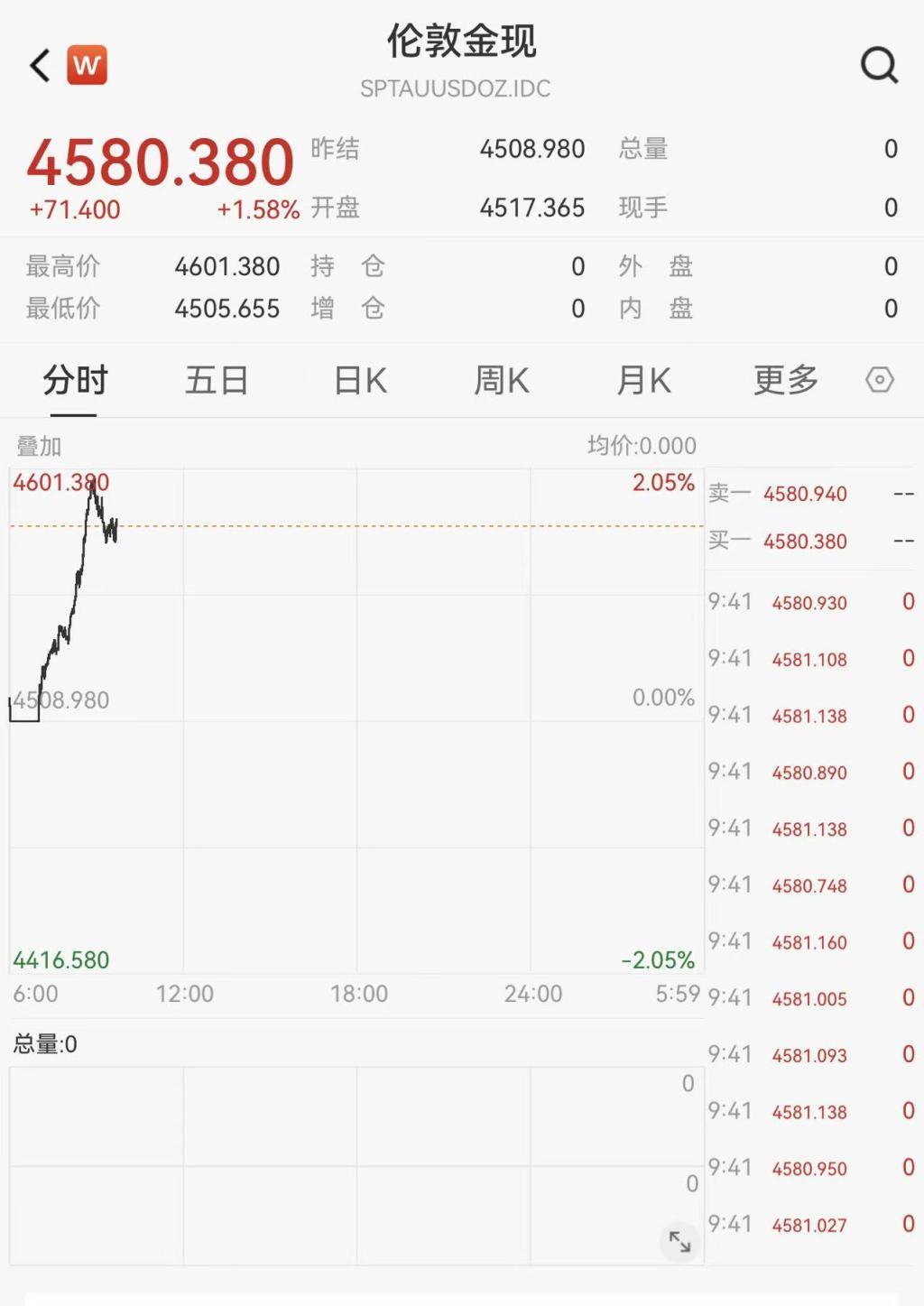 Wind数据显示,截至发稿,现货黄金冲高回落,报4580.38美元/盎司,日内涨1.58%。